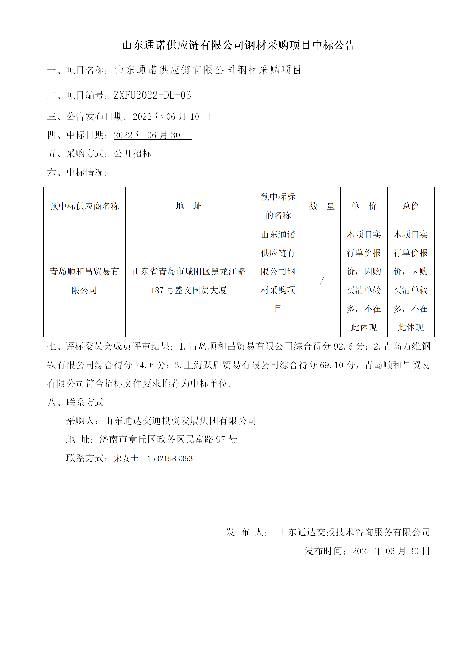 山東通諾供應(yīng)鏈有限公司鋼材采購(gòu)項(xiàng)目中標(biāo)公告