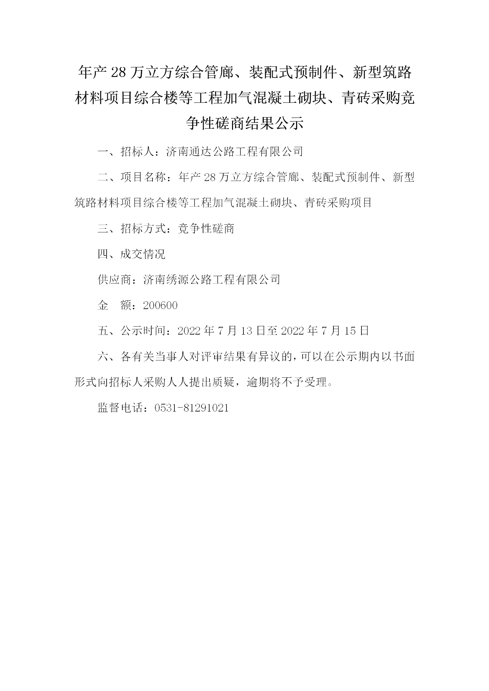 年產(chǎn)28萬(wàn)立方綜合管廊、裝配式預(yù)制件、新型筑路材料項(xiàng)目綜合樓等工程加氣混凝土砌塊、青磚采購(gòu)競(jìng)爭(zhēng)性磋商結(jié)果公示
