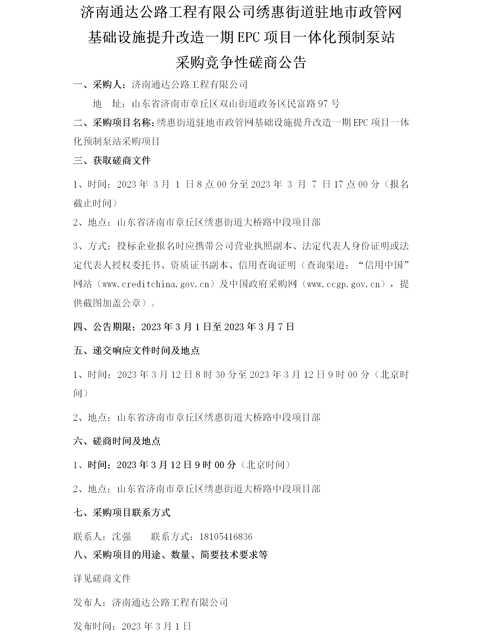 濟(jì)南通達(dá)公路工程有限公司繡惠街道駐地市政管網(wǎng)基礎(chǔ)設(shè)施提升改造一期EPC項(xiàng)目一體化預(yù)制泵站 采購(gòu)競(jìng)爭(zhēng)性磋商公告