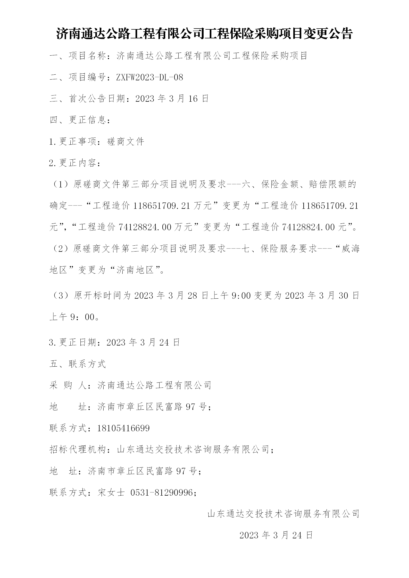 濟(jì)南通達(dá)公路工程有限公司工程保險(xiǎn)采購(gòu)項(xiàng)目變更公告