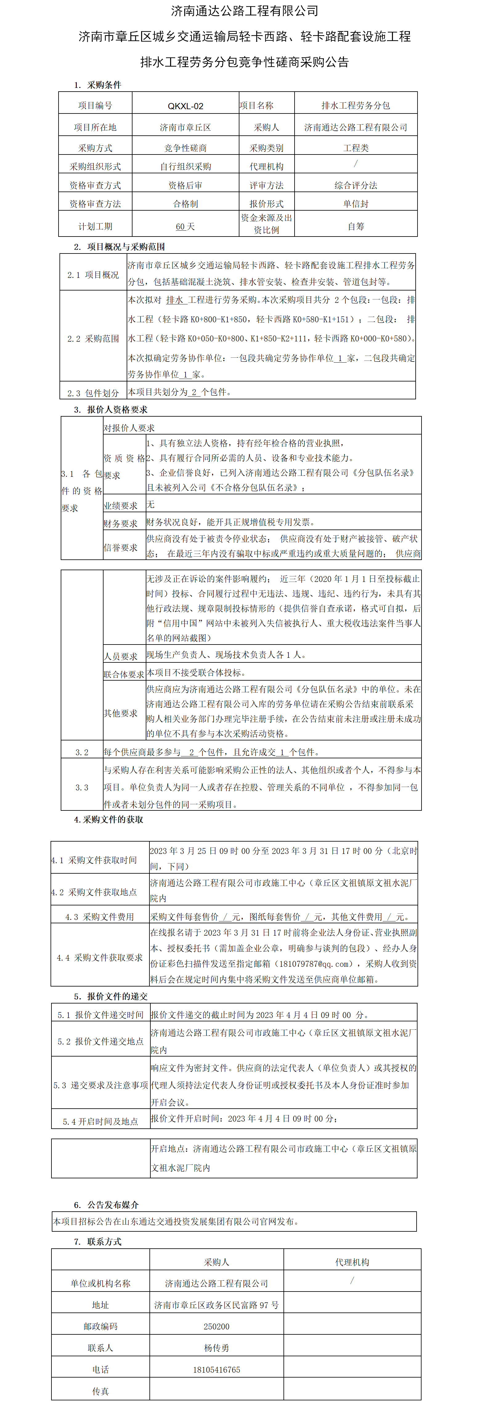 濟(jì)南通達(dá)公路工程有限公司 濟(jì)南市章丘區(qū)城鄉(xiāng)交通運(yùn)輸局輕卡西路、輕卡路配套設(shè)施工程 排水工程勞務(wù)分包競(jìng)爭(zhēng)性磋商采購(gòu)公告