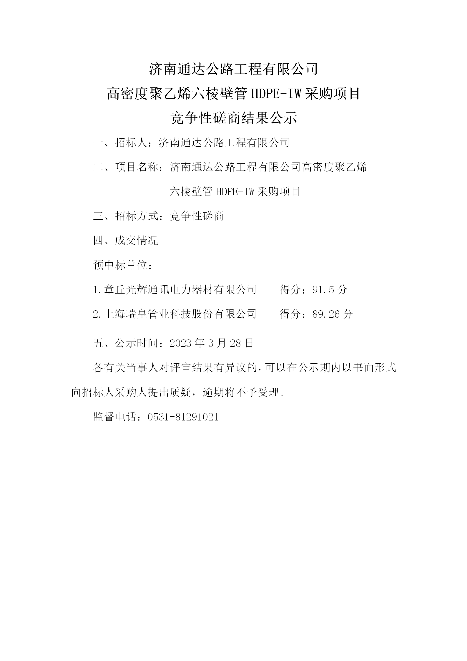 濟(jì)南通達(dá)公路工程有限公司 高密度聚乙烯六棱壁管HDPE-IW采購項(xiàng)目 競爭性磋商結(jié)果公示