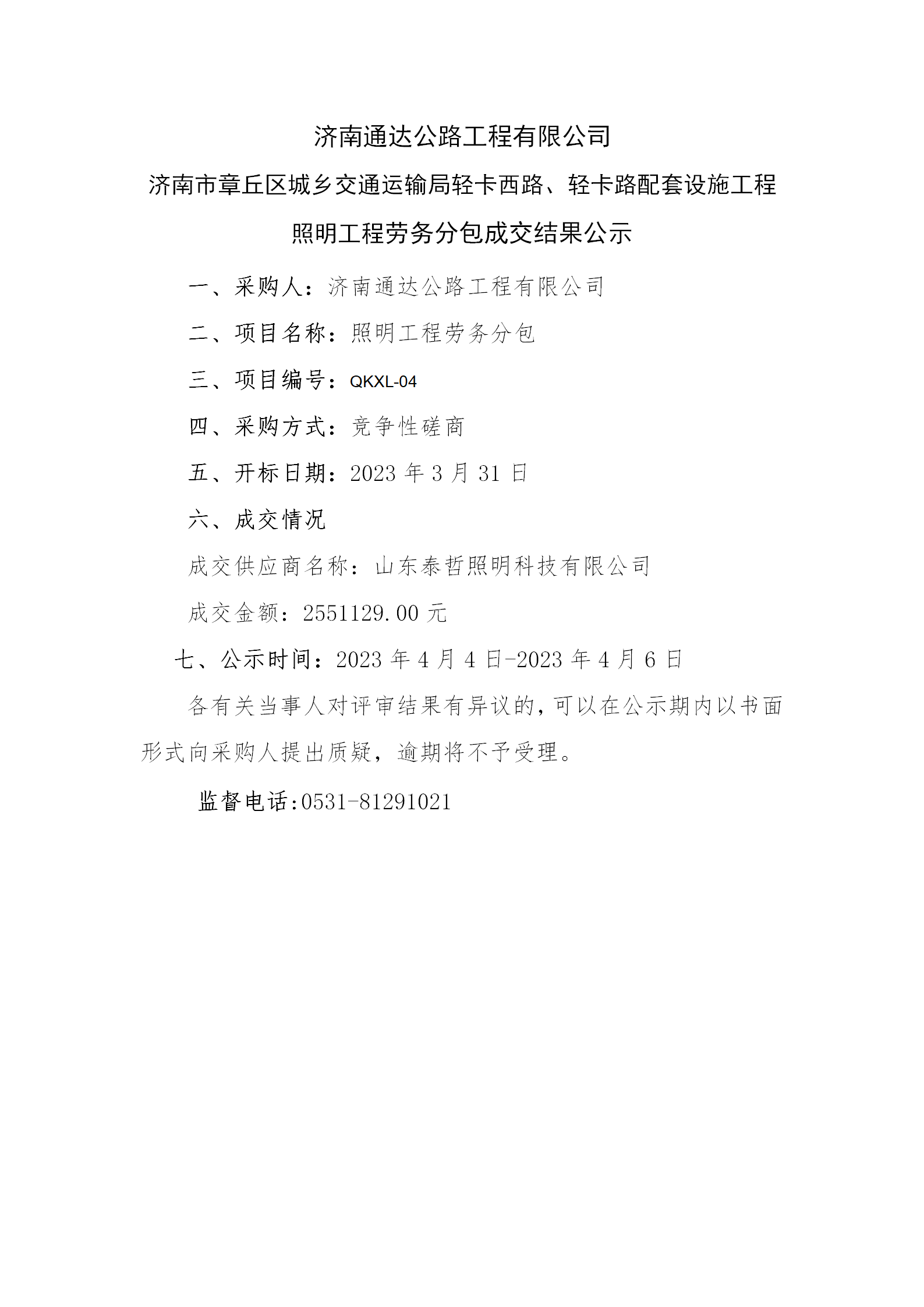 濟南通達公路工程有限公司 濟南市章丘區(qū)城鄉(xiāng)交通運輸局輕卡西路、輕卡路配套設(shè)施工程 照明工程勞務(wù)分包成交結(jié)果公示
