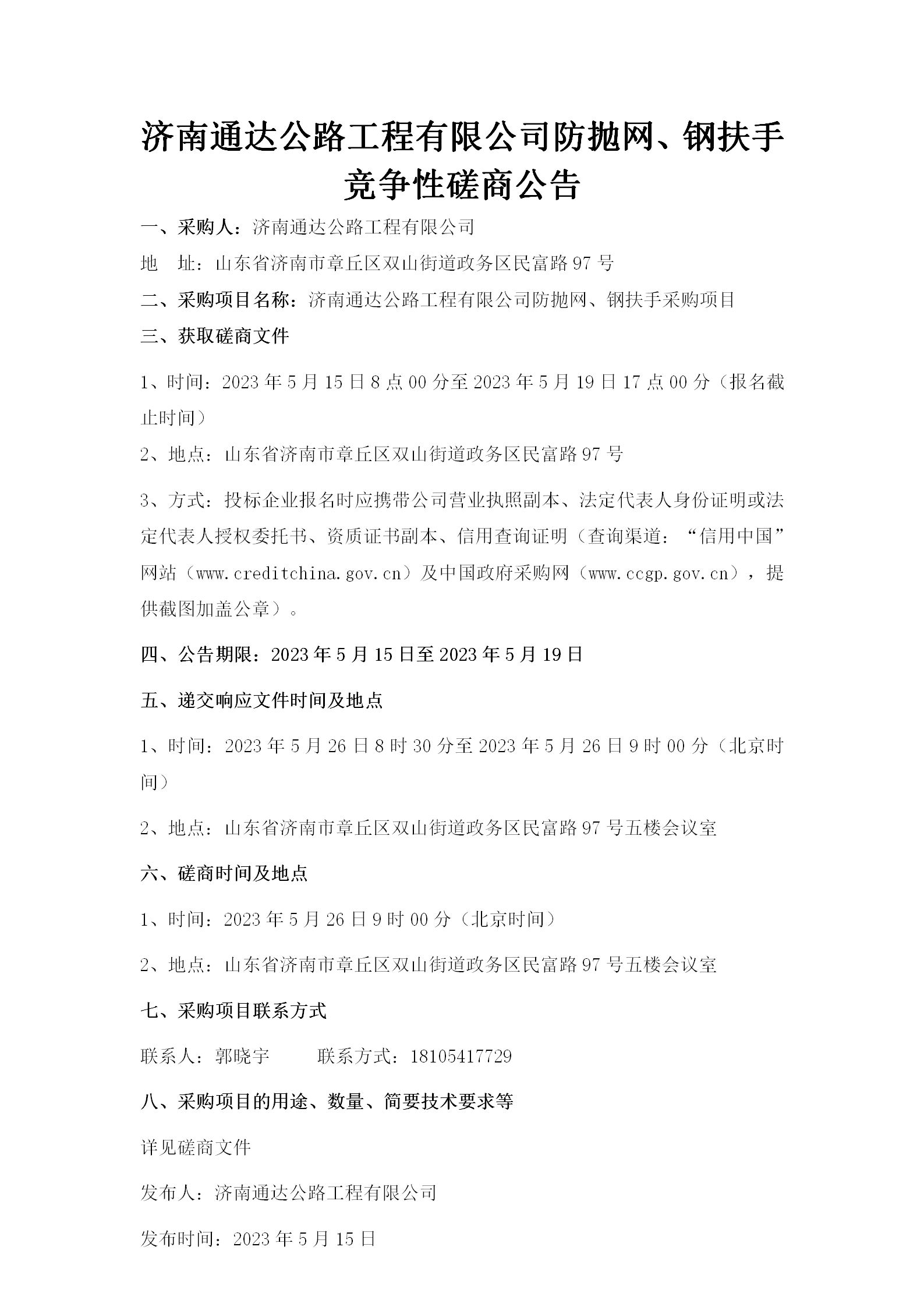 濟(jì)南通達(dá)公路工程有限公司防拋網(wǎng)、鋼扶手競(jìng)爭(zhēng)性磋商公告