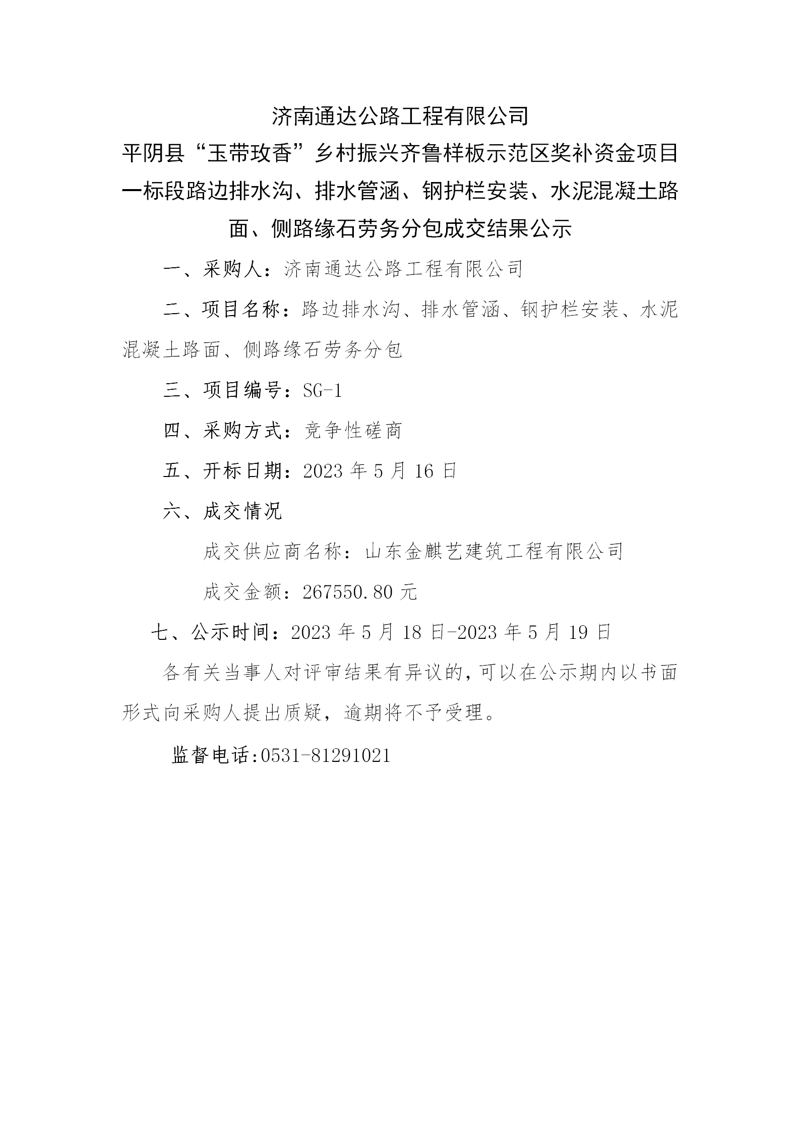 濟(jì)南通達(dá)公路工程有限公司 平陰縣“玉帶玫香”鄉(xiāng)村振興齊魯樣板示范區(qū)獎(jiǎng)補(bǔ)資金項(xiàng)目一標(biāo)段路邊排水溝、排水管涵、鋼護(hù)欄安裝、水泥混凝土路面、側(cè)路緣石勞務(wù)分包成交結(jié)果公示