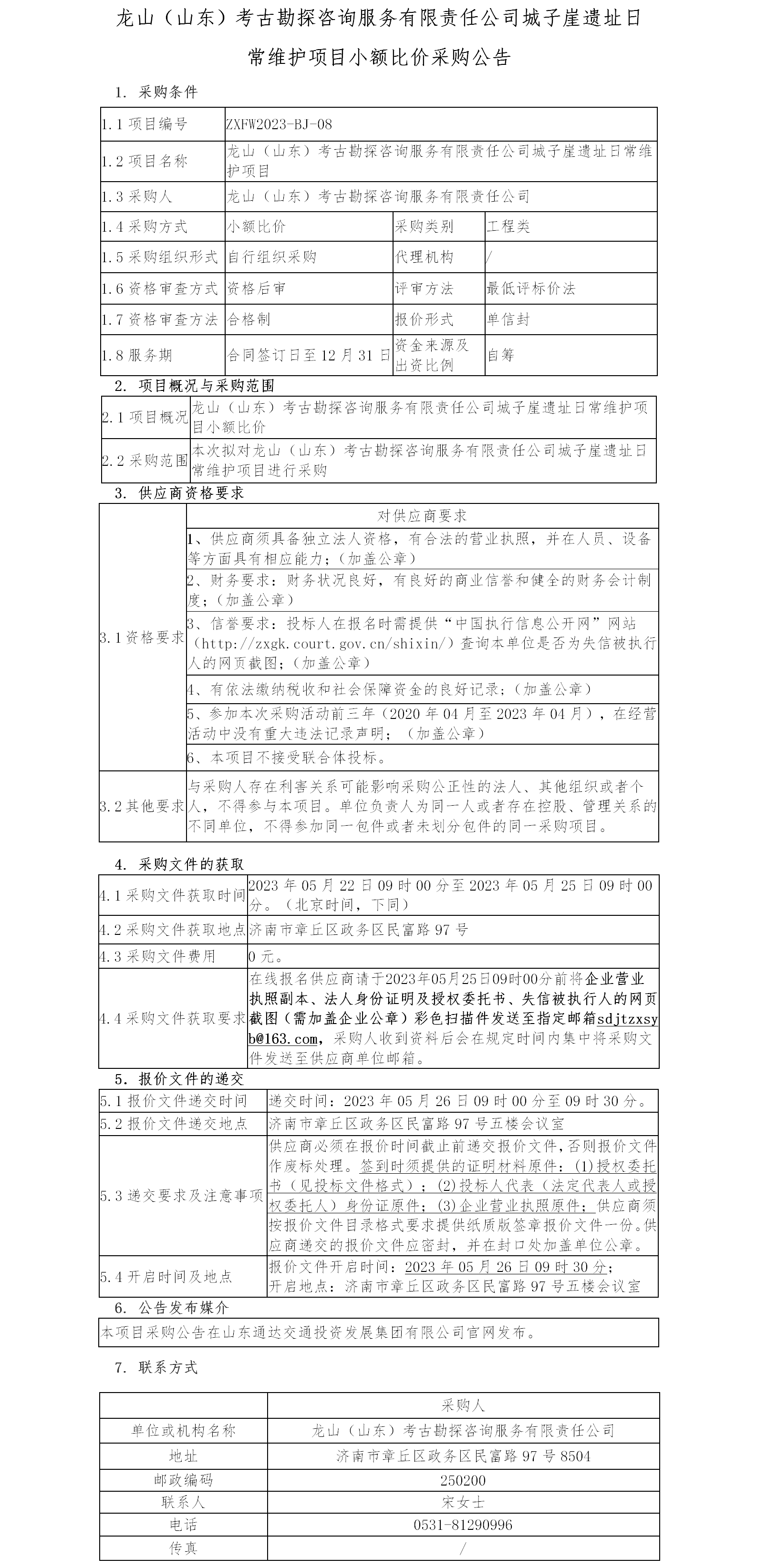 龍山(山東)考古勘探咨詢服務(wù)有限責(zé)任公司城子崖遺址日常維護項目小額比價采購公告