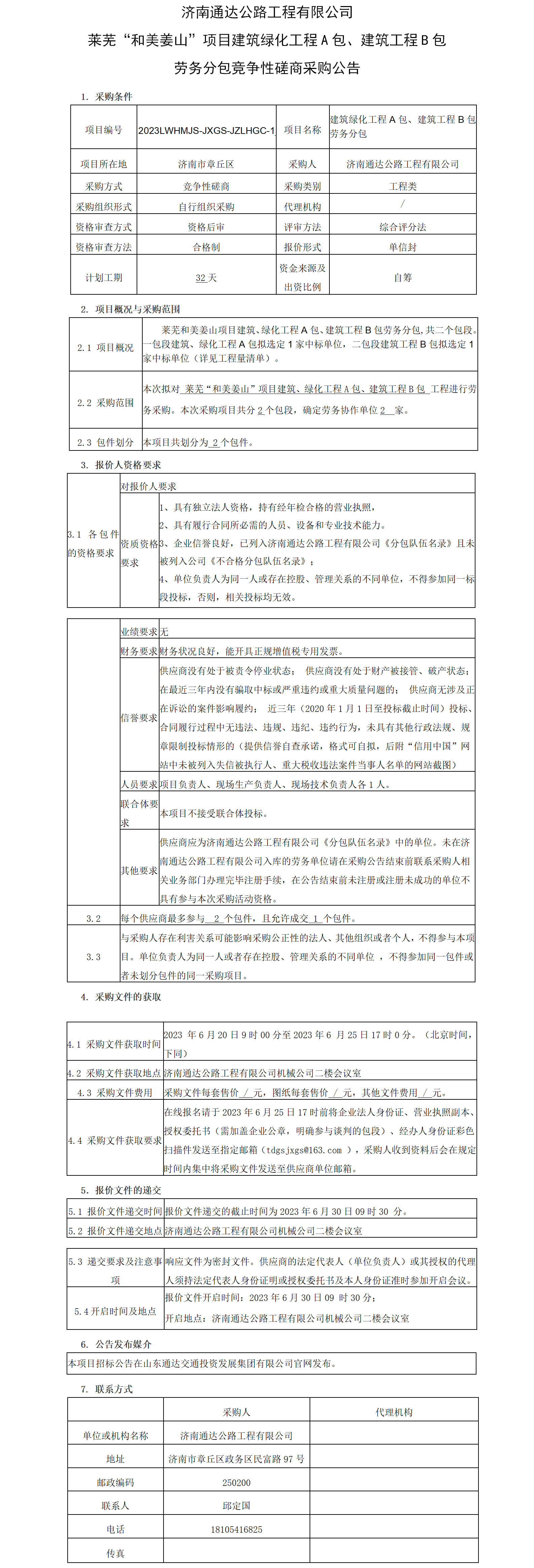 濟(jì)南通達(dá)公路工程有限公司 萊蕪“和美姜山”項(xiàng)目建筑綠化工程A包、建筑工程B包 勞務(wù)分包競爭性磋商采購公告