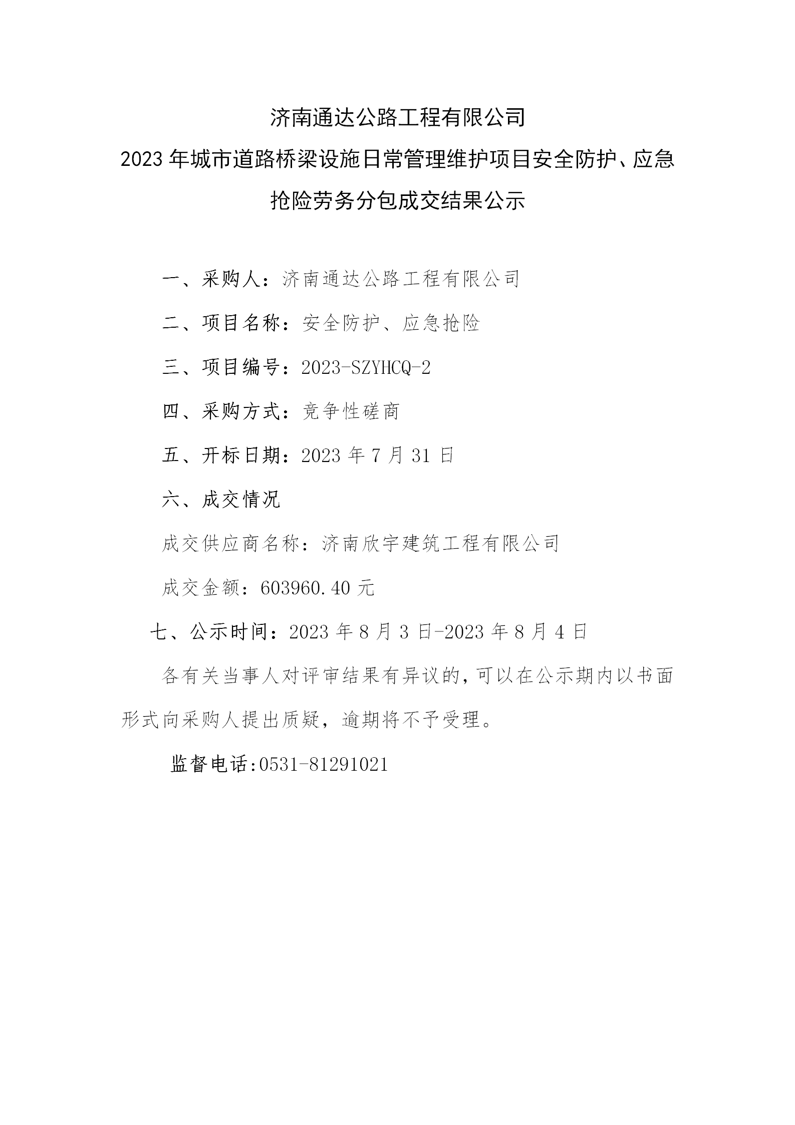 濟南通達(dá)公路工程有限公司 2023年城市道路橋梁設(shè)施日常管理維護項目安全防護、應(yīng)急搶險勞務(wù)分包成交結(jié)果公示