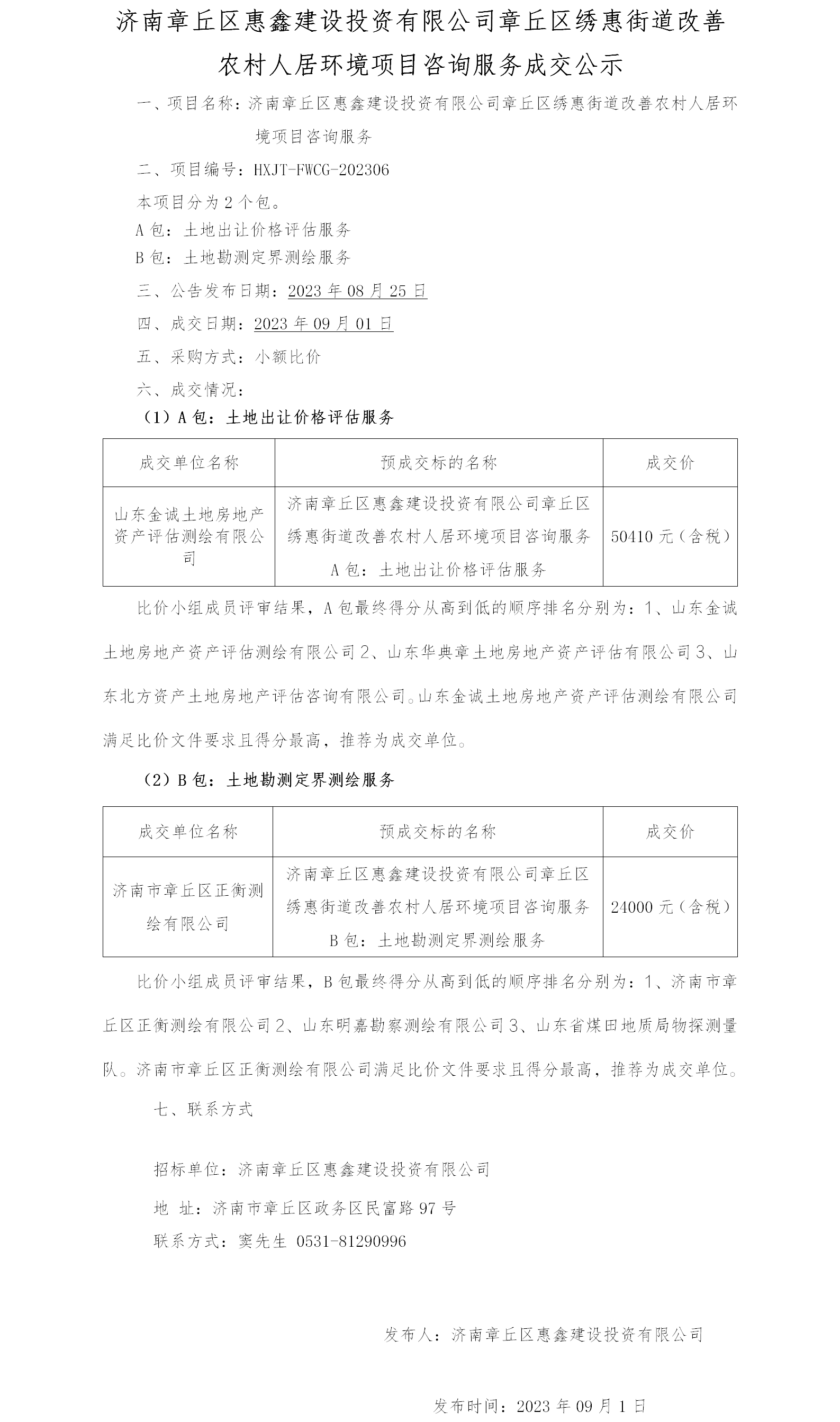 濟(jì)南章丘區(qū)惠鑫建設(shè)投資有限公司章丘區(qū)繡惠街道改善農(nóng)村人居環(huán)境項目咨詢服務(wù)成交公示