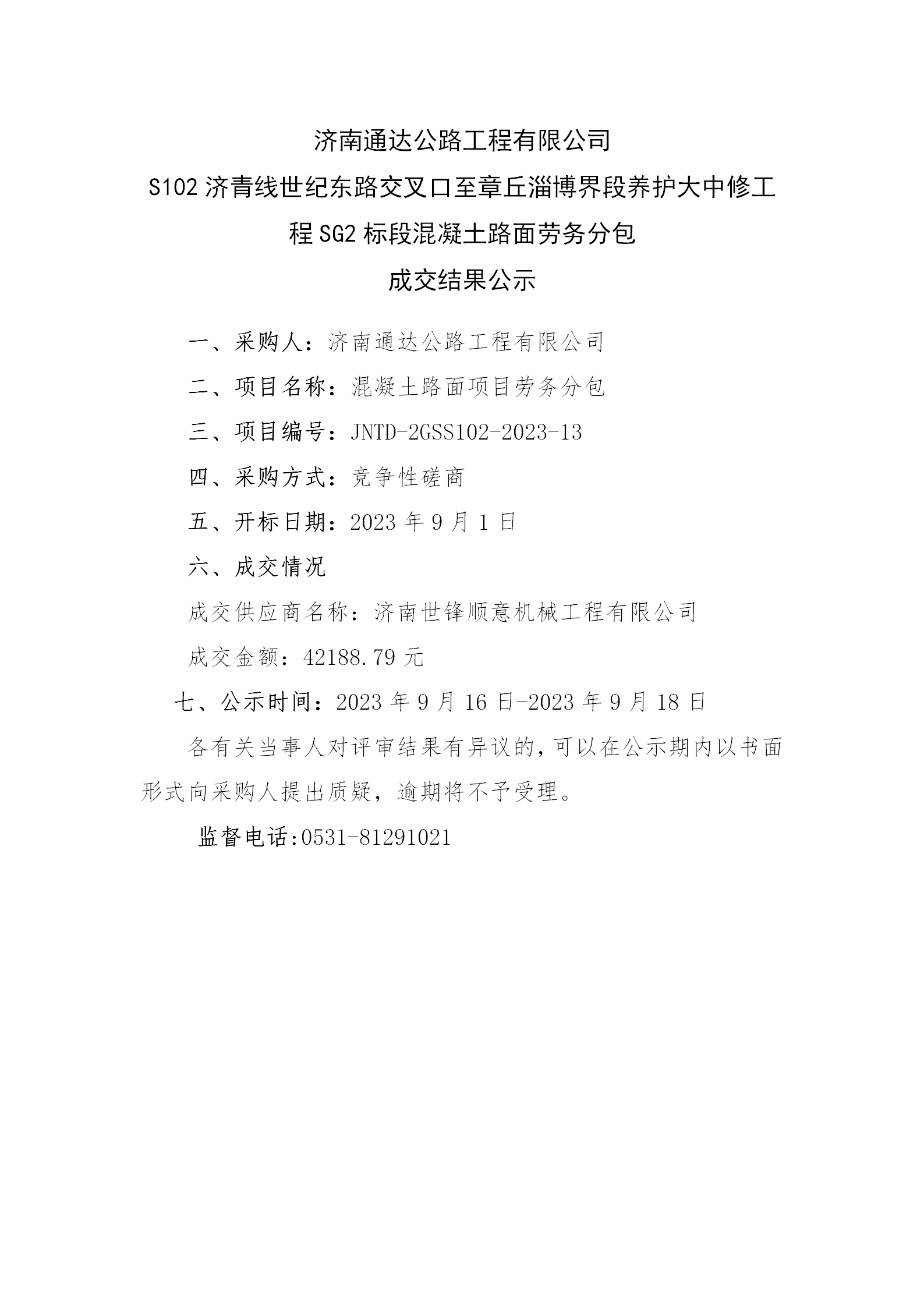 濟(jì)南通達(dá)公路工程有限公司 S102濟(jì)青線世紀(jì)東路交叉口至章丘淄博界段養(yǎng)護(hù)大中修工程SG2標(biāo)段混凝土路面勞務(wù)分包 成交結(jié)果公示