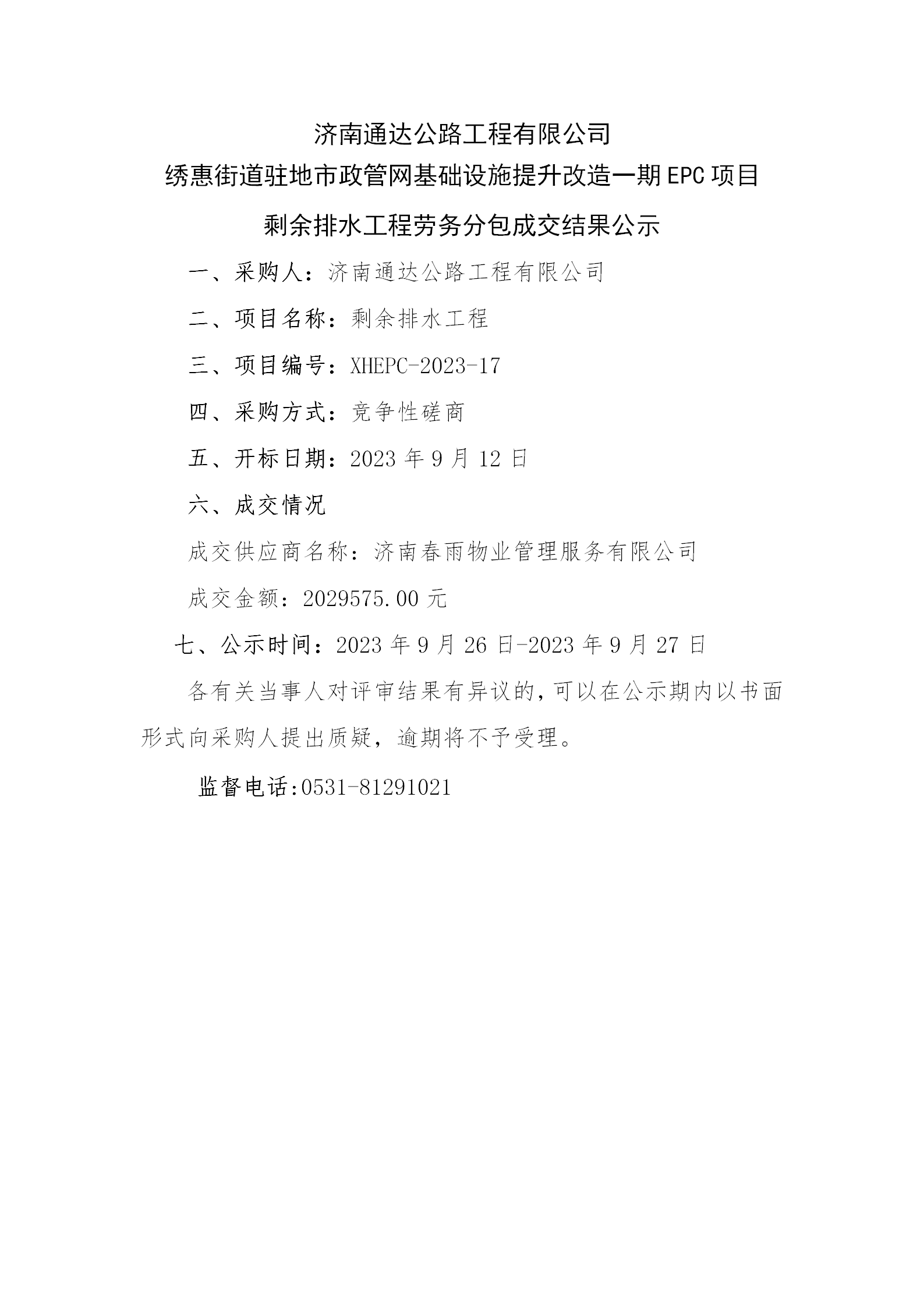 濟(jì)南通達(dá)公路工程有限公司 繡惠街道駐地市政管網(wǎng)基礎(chǔ)設(shè)施提升改造一期EPC項(xiàng)目 剩余排水工程勞務(wù)分包成交結(jié)果公示