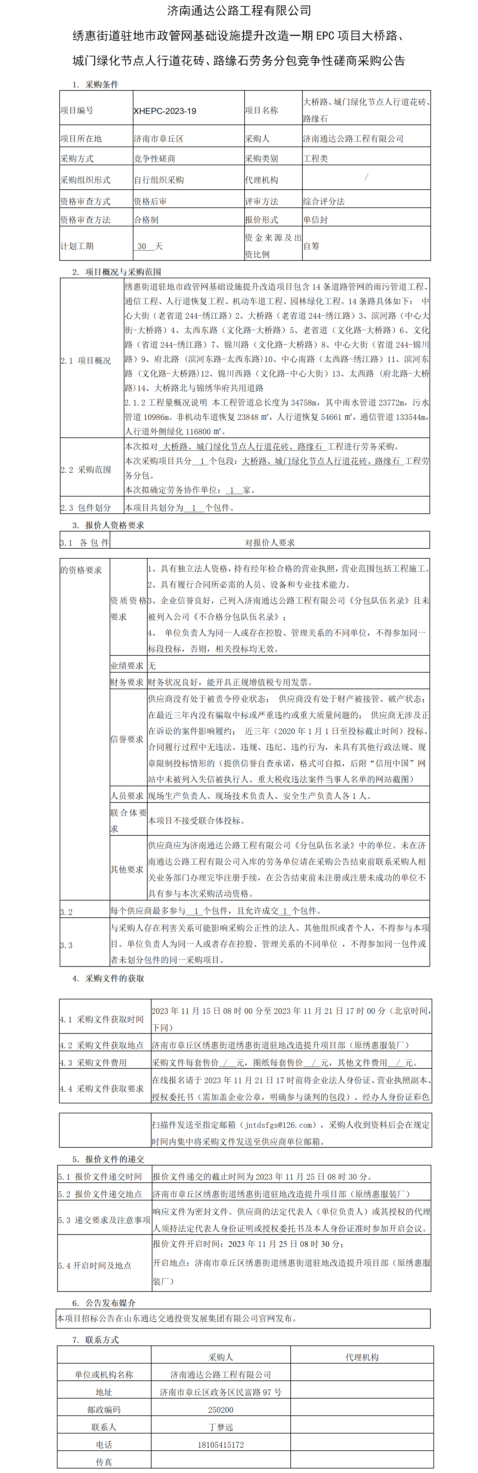 濟(jì)南通達(dá)公路工程有限公司 繡惠街道駐地市政管網(wǎng)基礎(chǔ)設(shè)施提升改造一期EPC項(xiàng)目大橋路、城門綠化節(jié)點(diǎn)人行道花磚、路緣石勞務(wù)分包競(jìng)爭(zhēng)性磋商采購(gòu)公告