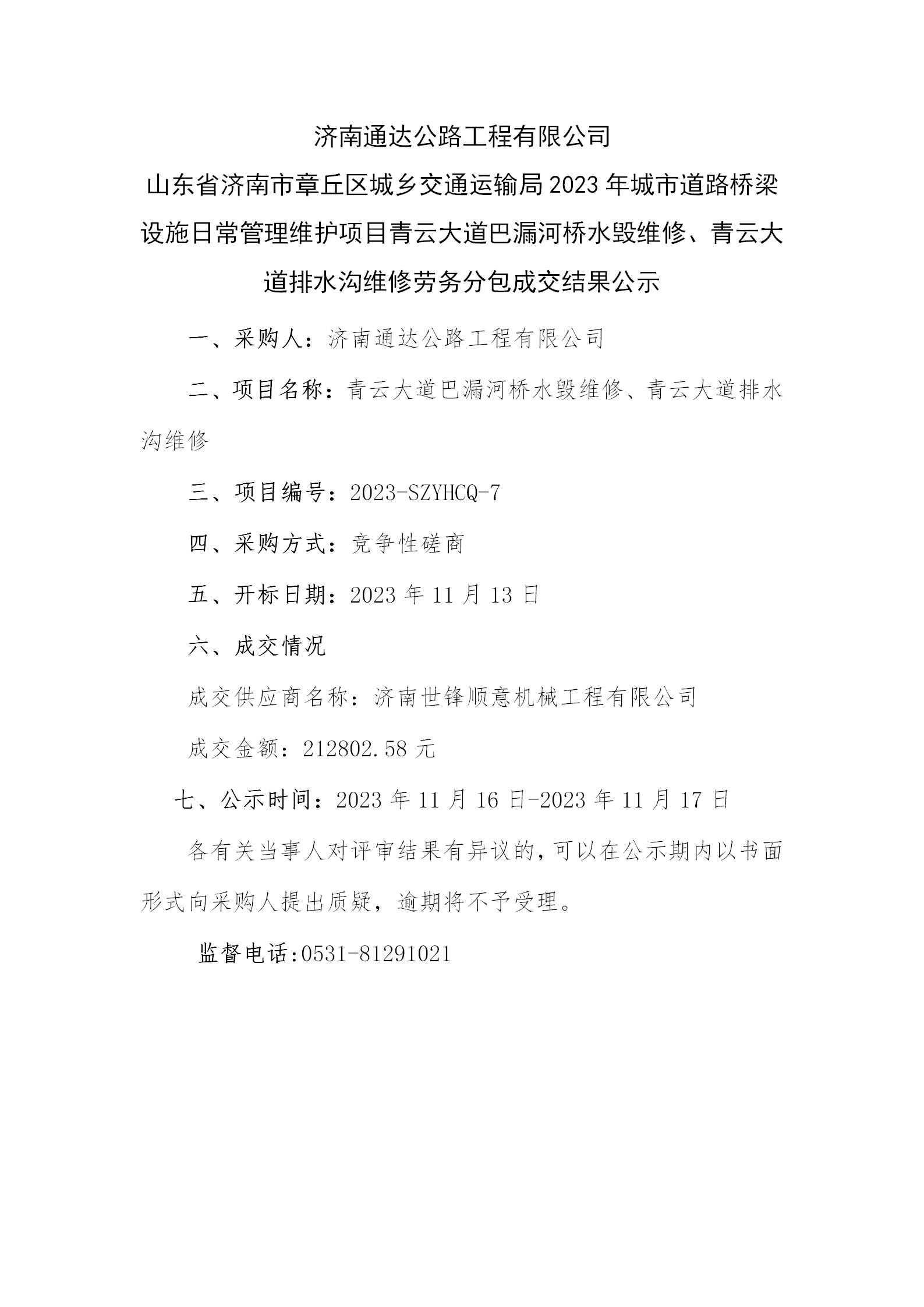 濟南通達公路工程有限公司 山東省濟南市章丘區(qū)城鄉(xiāng)交通運輸局2023年城市道路橋梁設(shè)施日常管理維護項目青云大道巴漏河橋水毀維修、青云大道排水溝維修勞務(wù)分包成交結(jié)果公示