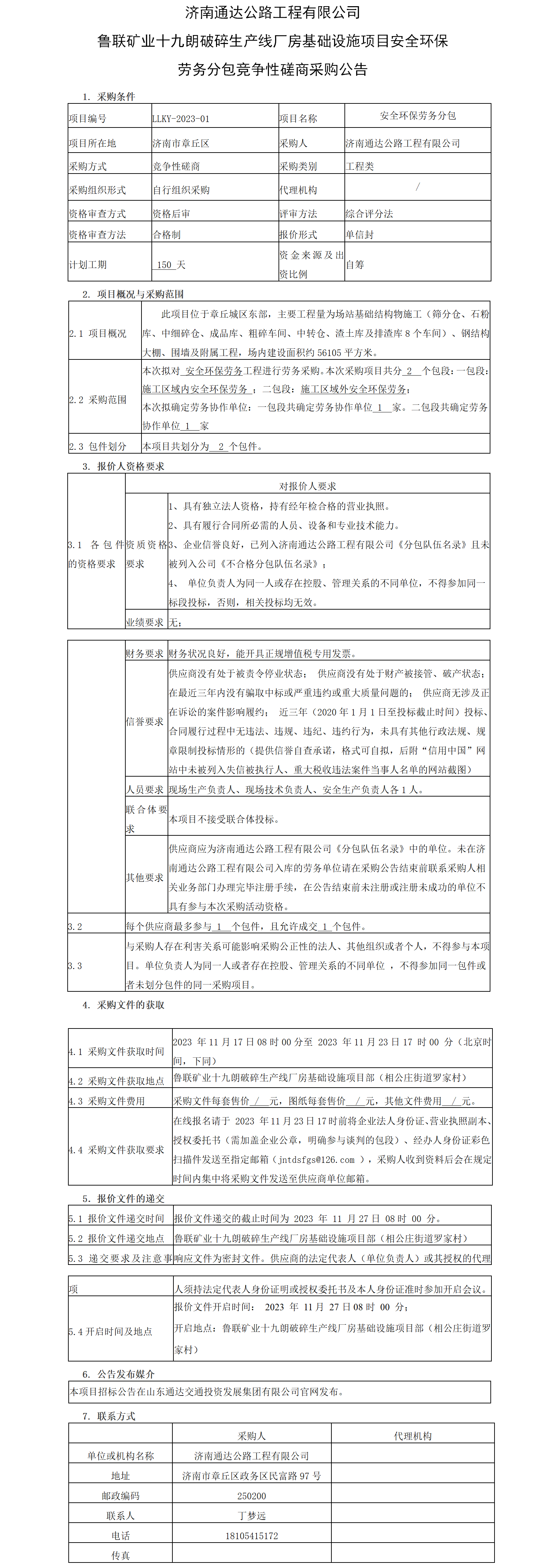 濟(jì)南通達(dá)公路工程有限公司 魯聯(lián)礦業(yè)十九朗破碎生產(chǎn)線廠房基礎(chǔ)設(shè)施項(xiàng)目安全環(huán)保 勞務(wù)分包競(jìng)爭(zhēng)性磋商采購(gòu)公告