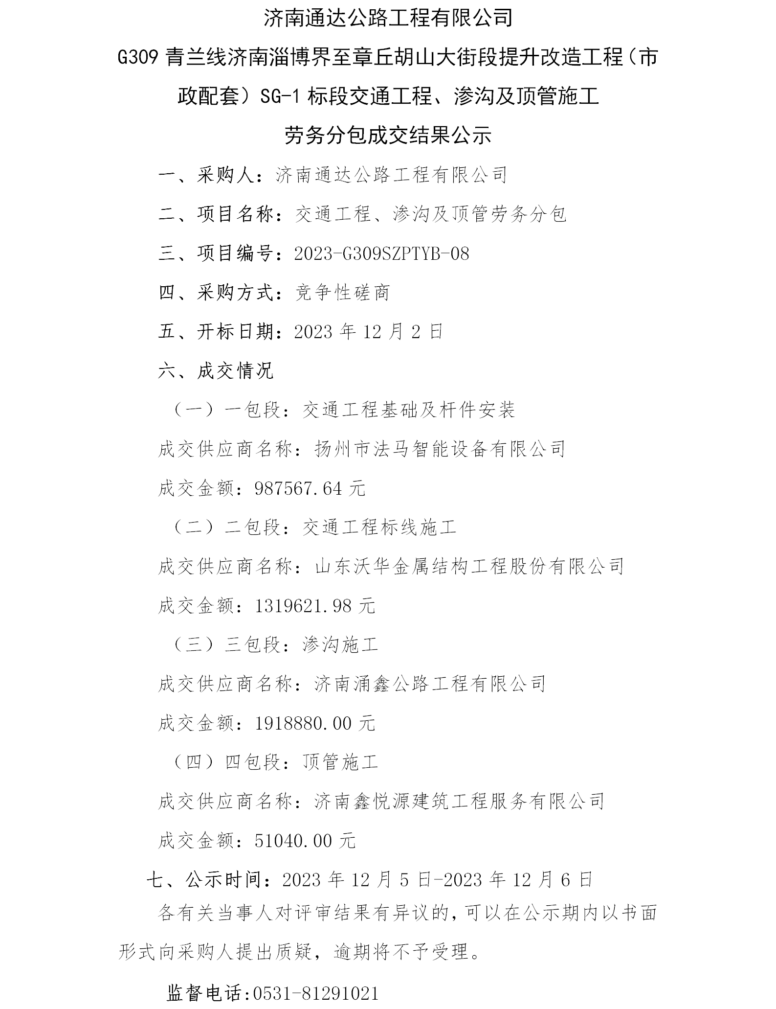 濟(jì)南通達(dá)公路工程有限公司 G309青蘭線濟(jì)南淄博界至章丘胡山大街段提升改造工程(市政配套)SG-1標(biāo)段交通工程、滲溝及頂管施工 勞務(wù)分包成交結(jié)果公示
