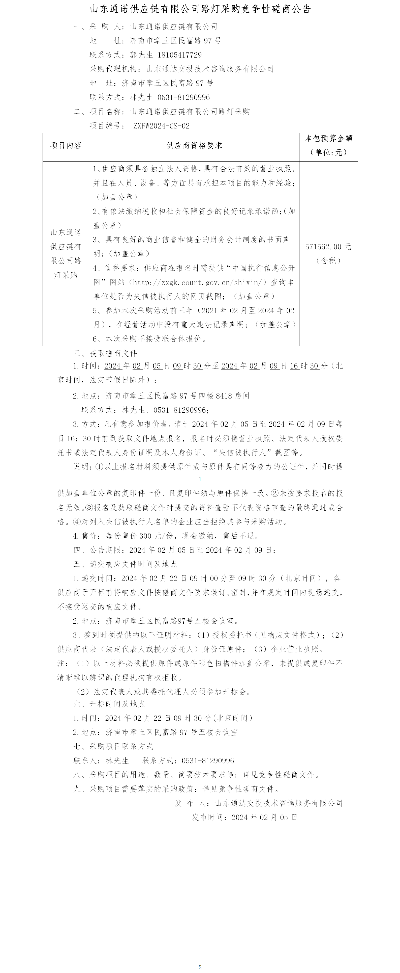 山東通諾供應(yīng)鏈有限公司路燈采購競爭性磋商公告