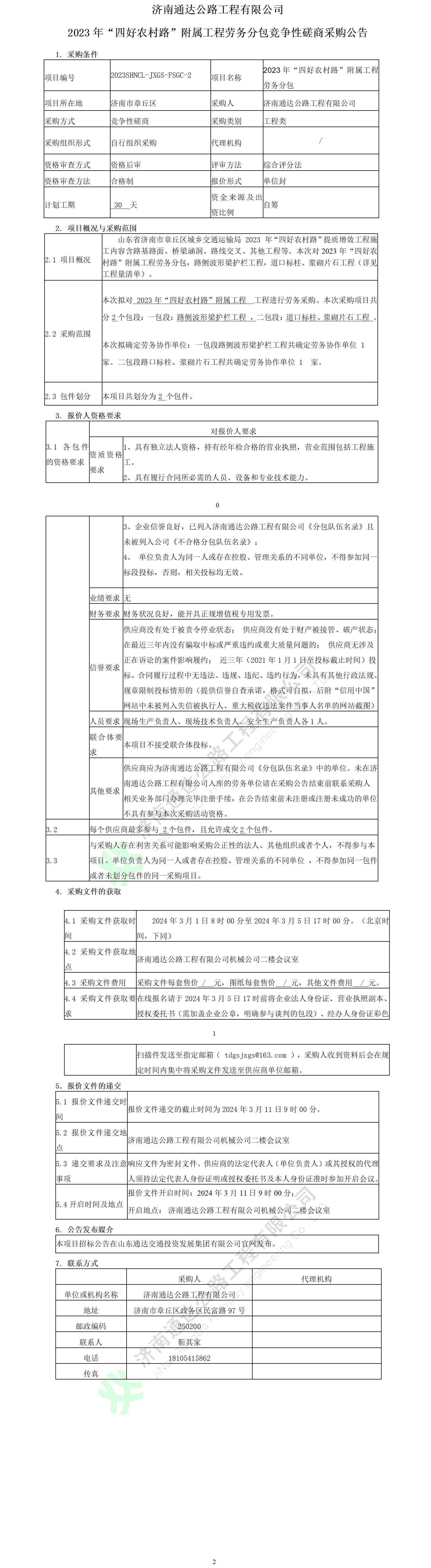 濟南通達公路工程有限公司 2023年“四好農(nóng)村路”附屬工程勞務分包競爭性磋商采購公告