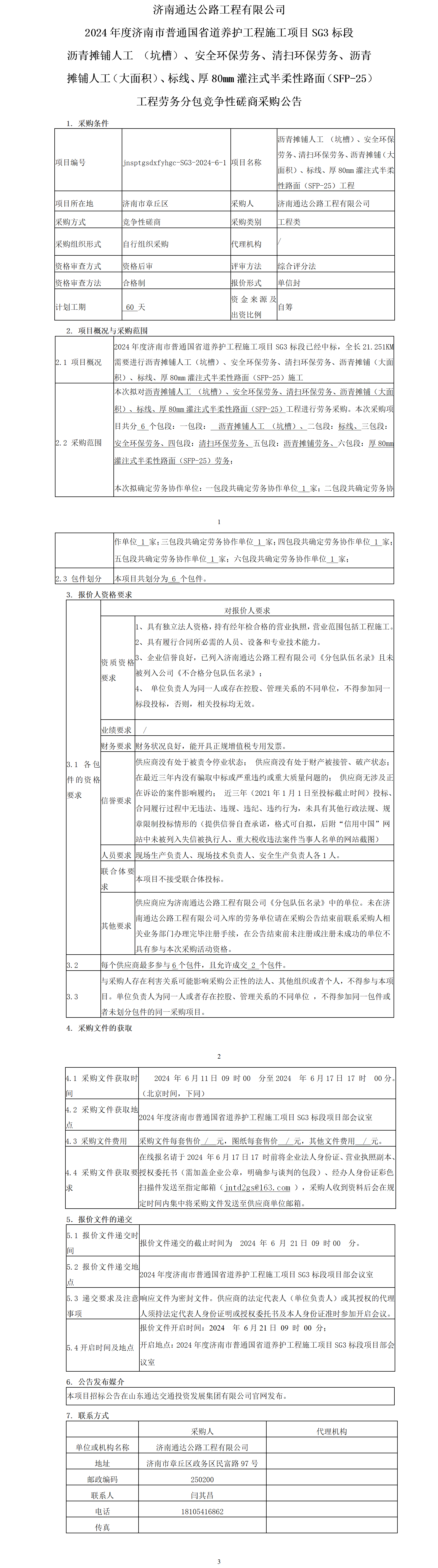 濟南通達公路工程有限公司 2024年度濟南市普通國省道養(yǎng)護工程施工項目SG3標段 瀝青攤鋪人工 (坑槽)、安全環(huán)保勞務、清掃環(huán)保勞務、瀝青攤鋪人工(大面積)、標線、厚80mm灌注式半柔性路面(SFP-25)工程勞務分包競爭性磋商采購公告