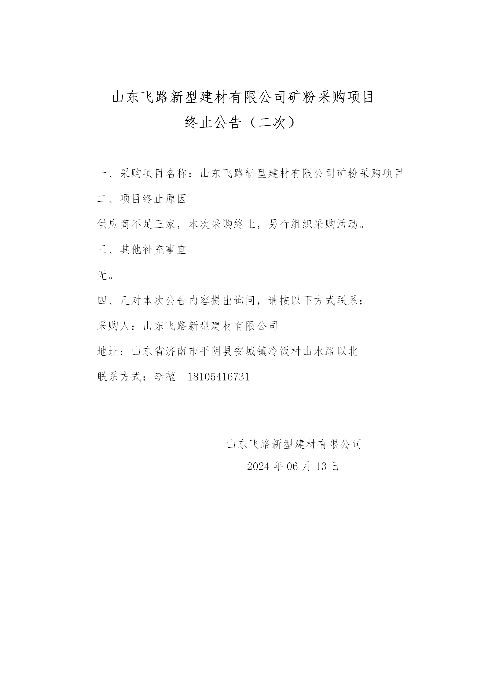 山東飛路新型建材有限公司礦粉采購(gòu)項(xiàng)目 終止公告(二次)