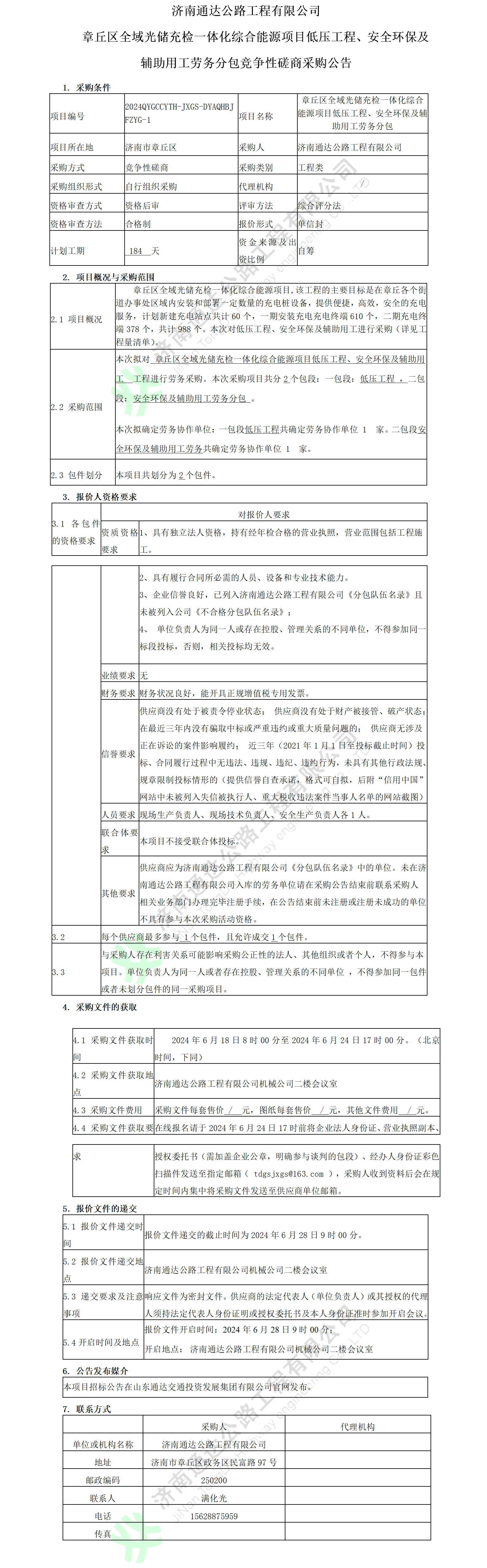 濟(jì)南通達(dá)公路工程有限公司 章丘區(qū)全域光儲(chǔ)充檢一體化綜合能源項(xiàng)目低壓工程、安全環(huán)保及 輔助用工勞務(wù)分包競(jìng)爭(zhēng)性磋商采購(gòu)公告