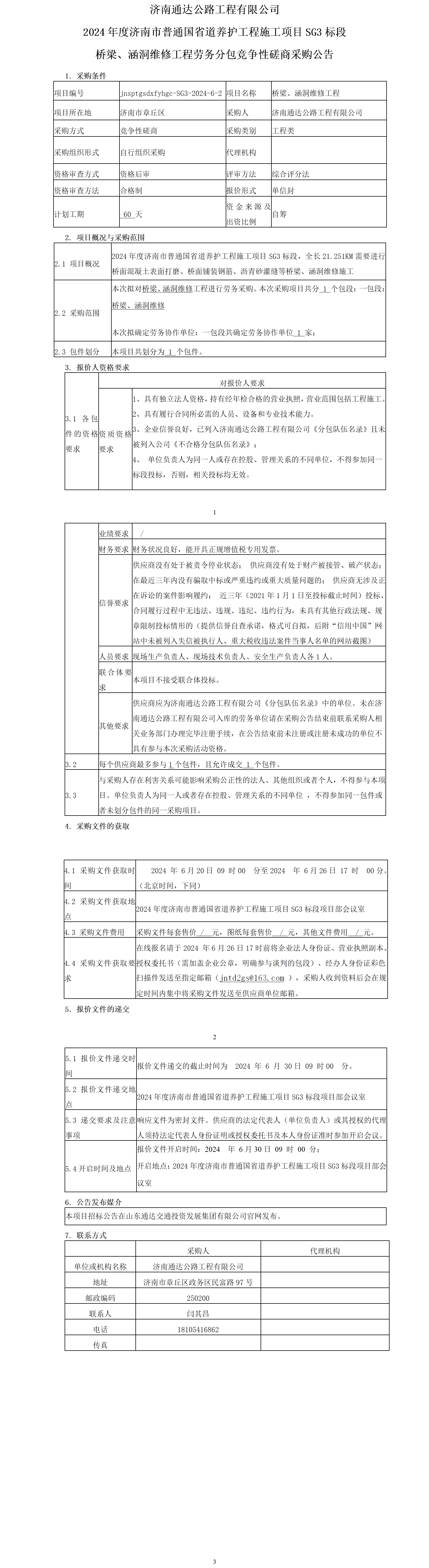濟南通達公路工程有限公司 2024年度濟南市普通國省道養(yǎng)護工程施工項目SG3標段 橋梁、涵洞維修工程勞務分包競爭性磋商采購公告