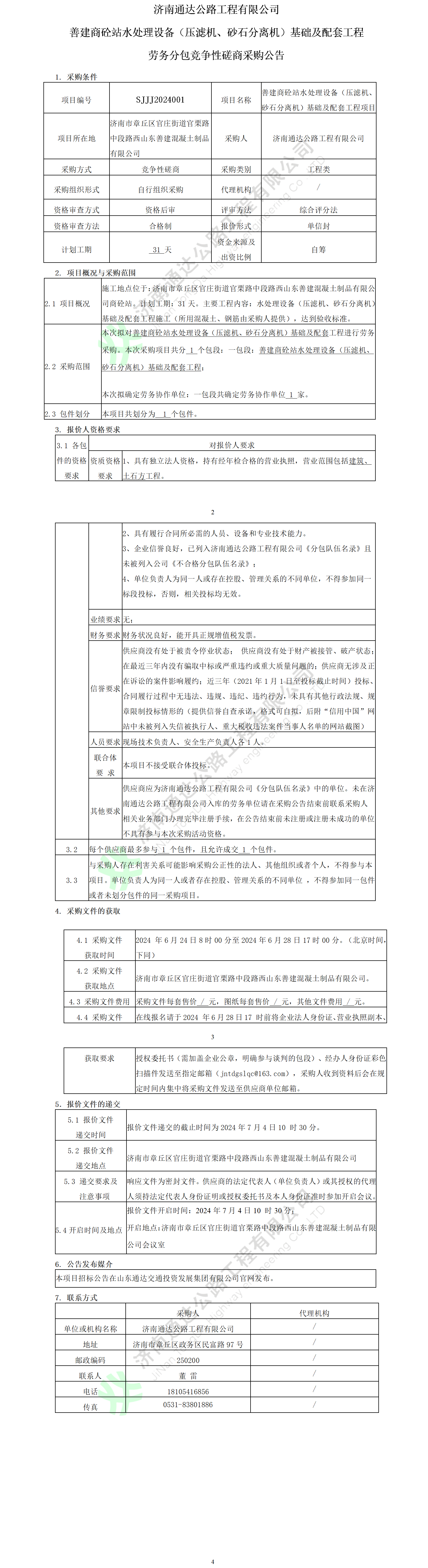 濟南通達公路工程有限公司 善建商砼站水處理設(shè)備(壓濾機、砂石分離機)基礎(chǔ)及配套工程 勞務分包競爭性磋商采購公告