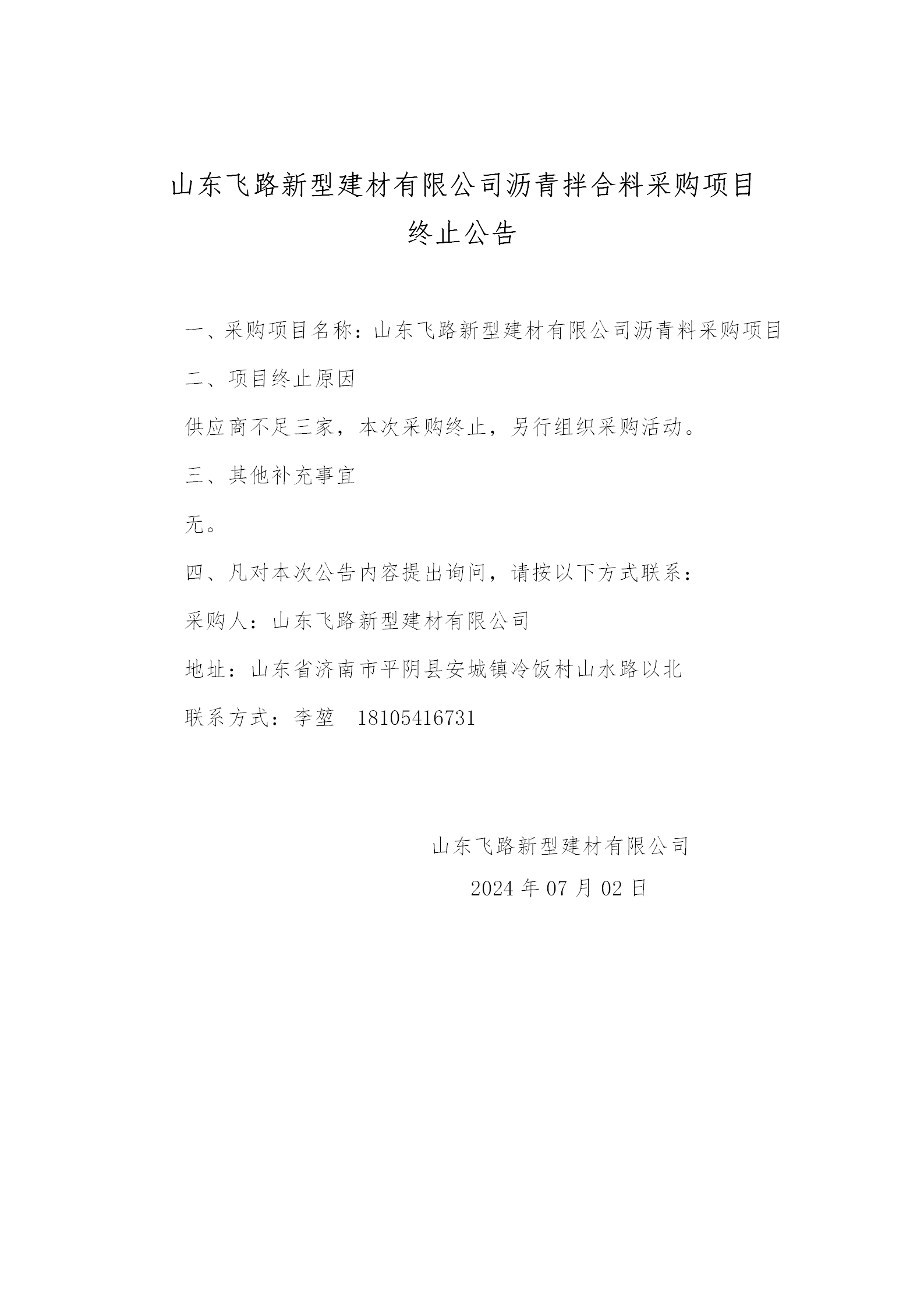 山東飛路新型建材有限公司瀝青拌合料采購(gòu)項(xiàng)目 終止公告