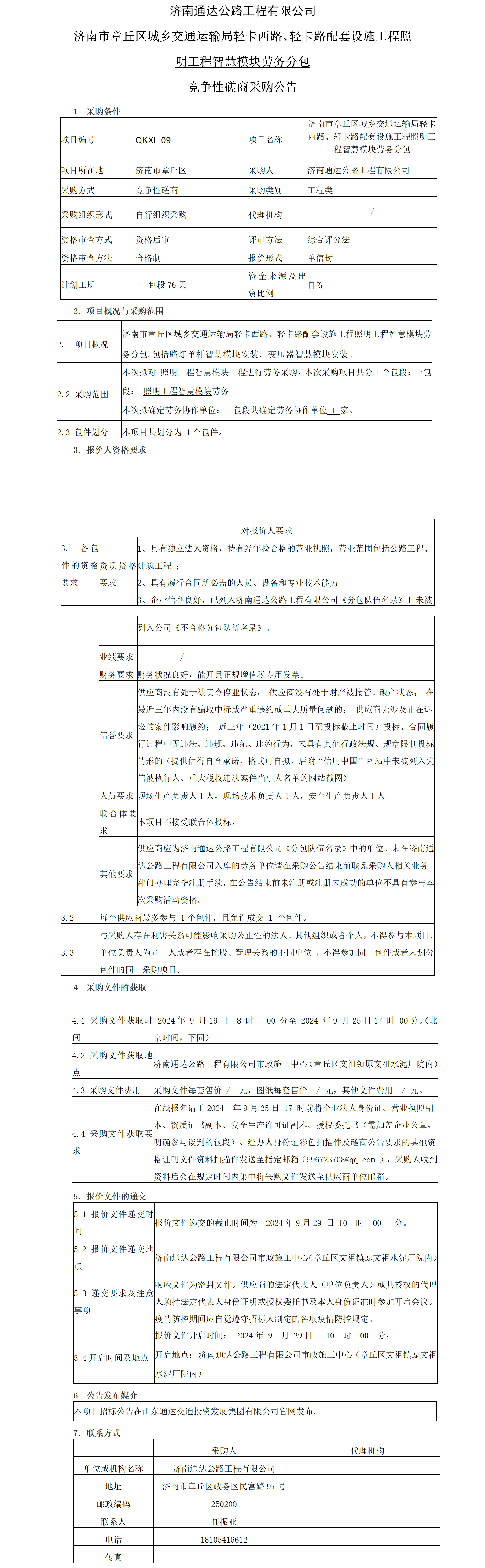濟(jì)南通達(dá)公路工程有限公司 濟(jì)南市章丘區(qū)城鄉(xiāng)交通運輸局輕卡西路、輕卡路配套設(shè)施工程照明工程智慧模塊勞務(wù)分包 競爭性磋商采購公告