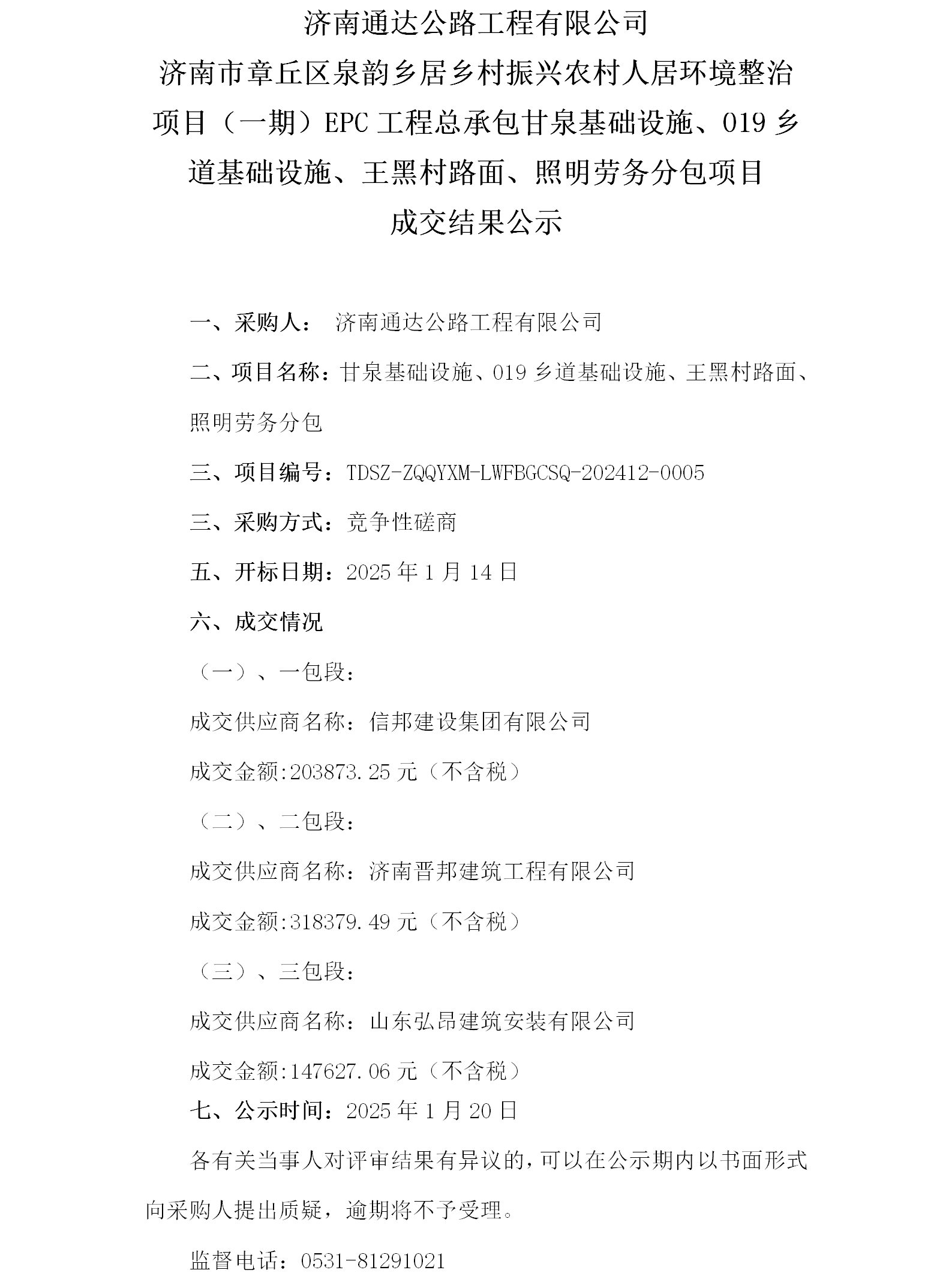 濟南通達公路工程有限公司 濟南市章丘區(qū)泉韻鄉(xiāng)居鄉(xiāng)村振興農(nóng)村人居環(huán)境整治項目(一期)EPC工程總承包甘泉基礎(chǔ)設(shè)施、019鄉(xiāng)道基礎(chǔ)設(shè)施、王黑村路面、照明勞務(wù)分包項目 成交結(jié)果公示