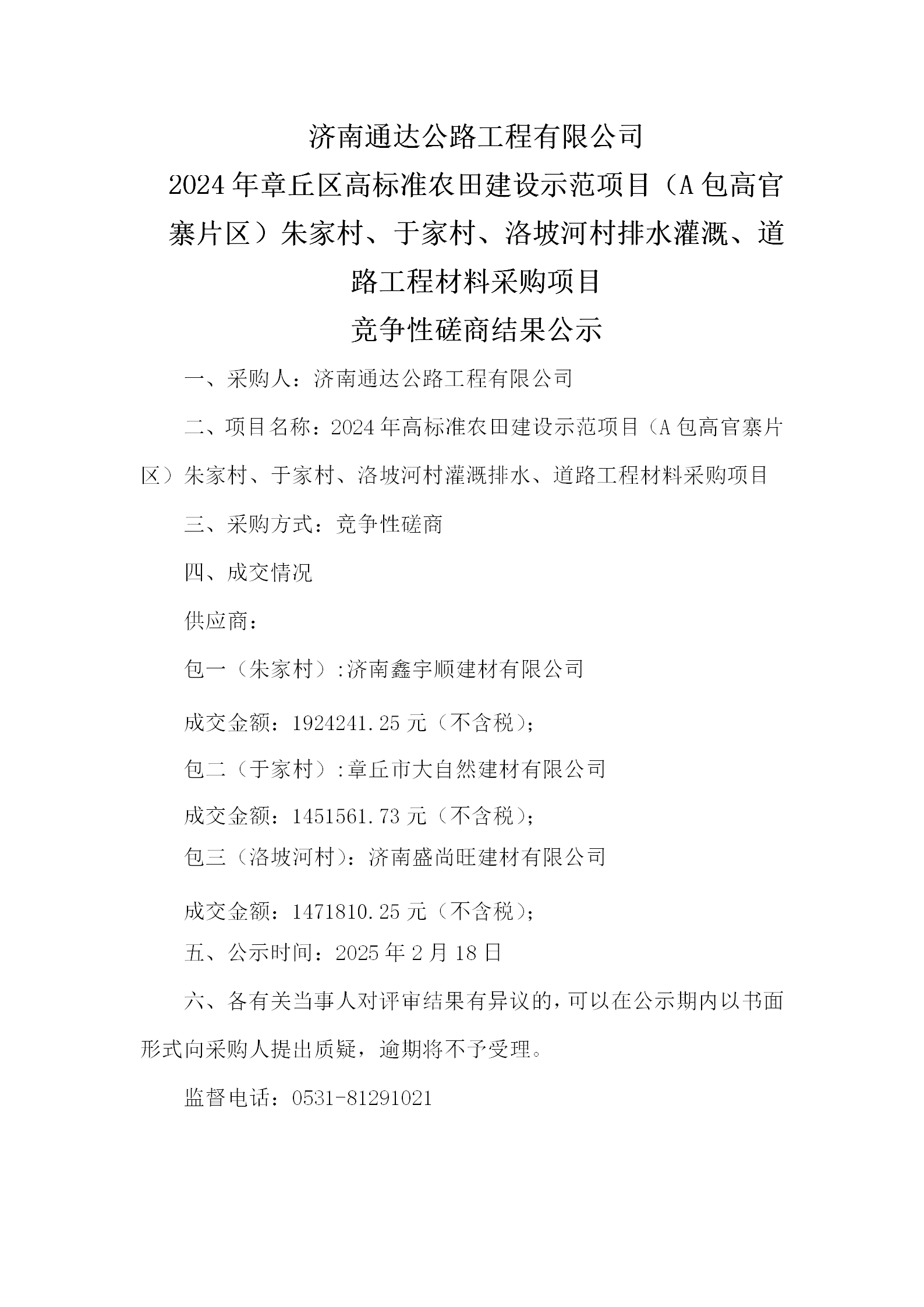 濟(jì)南通達(dá)公路工程有限公司2024年章丘區(qū)高標(biāo)準(zhǔn)農(nóng)田建設(shè)示范項(xiàng)目(A包高官寨片區(qū))朱家村、于家村、洛坡河村排水灌溉、道路工程材料采購項(xiàng)目競爭性磋商結(jié)果公示
