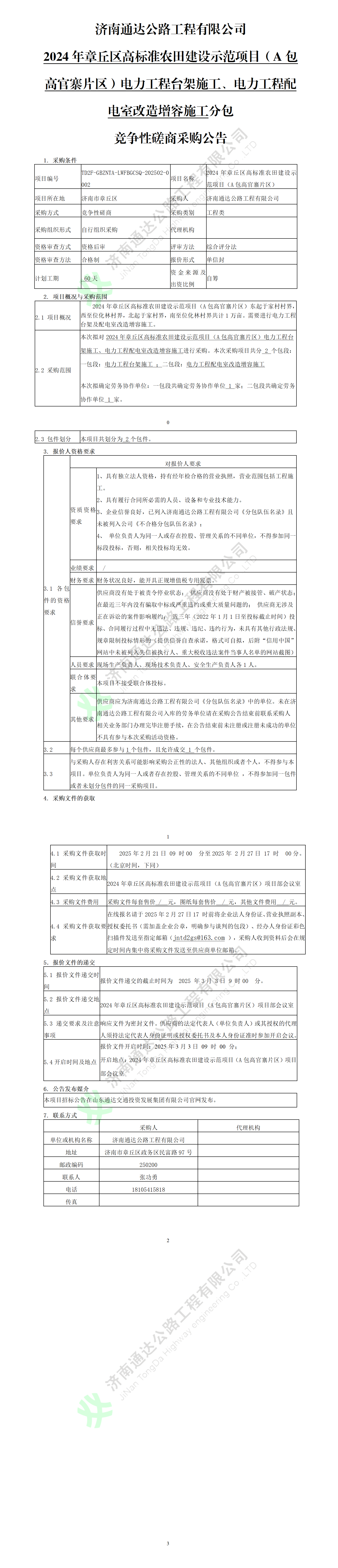 濟(jì)南通達(dá)公路工程有限公司2024年章丘區(qū)高標(biāo)準(zhǔn)農(nóng)田建設(shè)示范項(xiàng)目(A包高官寨片區(qū))電力工程臺(tái)架施工、電力工程配電室改造增容施工分包競(jìng)爭(zhēng)性磋商采購(gòu)公告