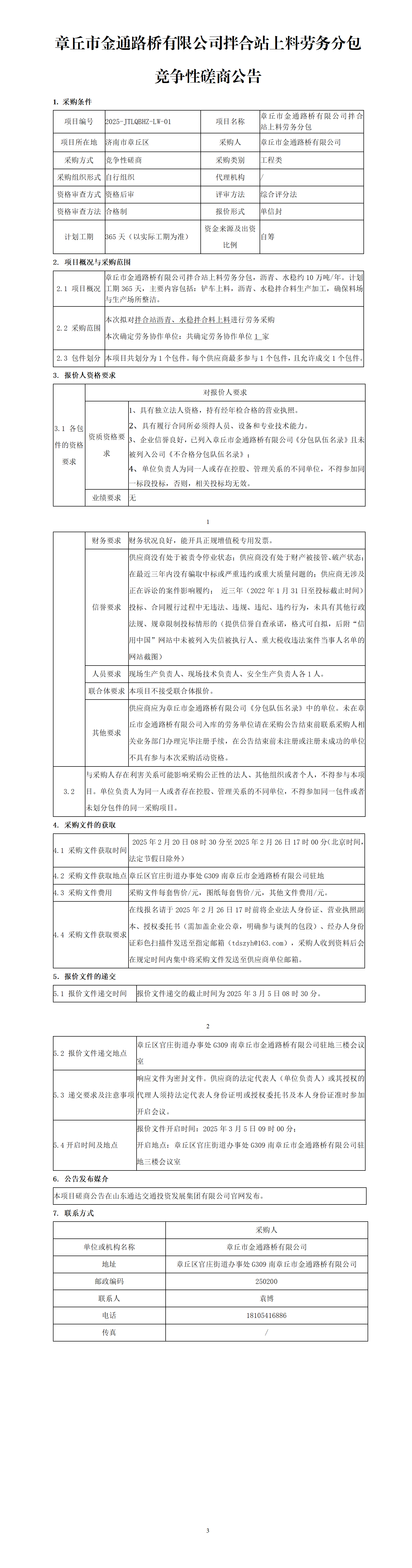 章丘市金通路橋有限公司拌合站上料勞務(wù)分包競爭性磋商公告
