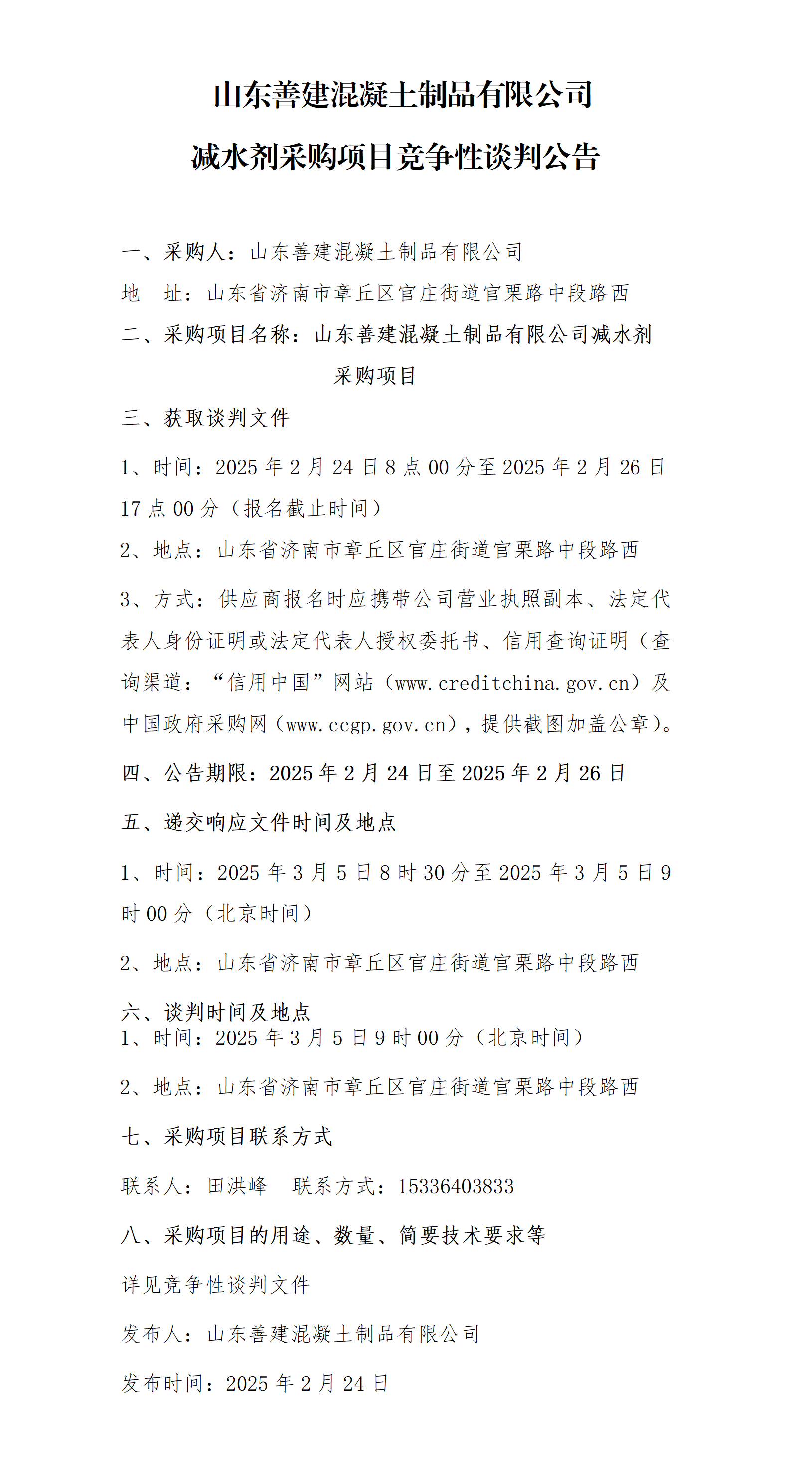 山東善建混凝土制品有限公司減水劑采購項目競爭性談判公告