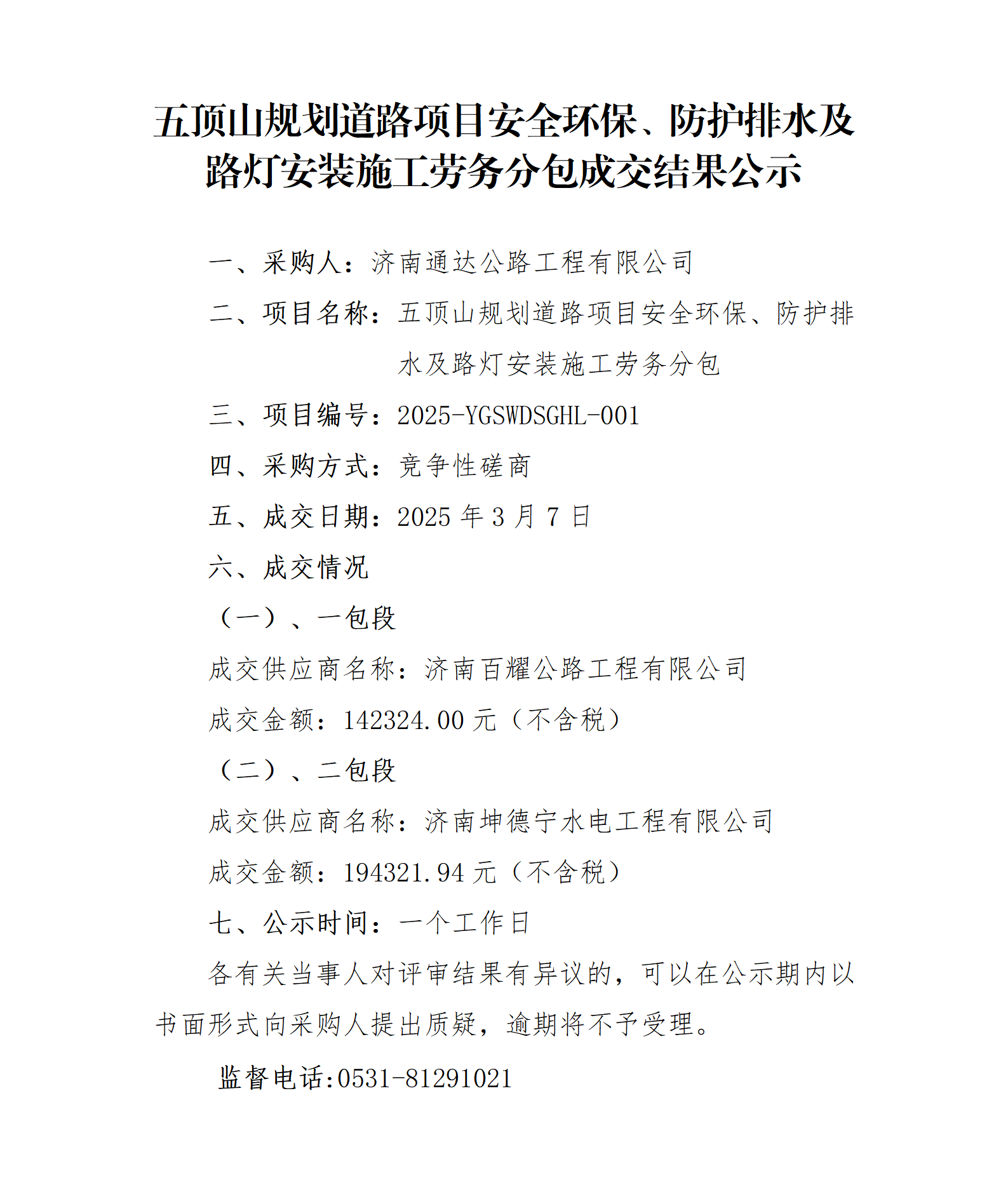 濟南通達公路工程有限公司五頂山規(guī)劃道路項目安全環(huán)保、防護排水及路燈安裝施工勞務(wù)分包成交結(jié)果公示
