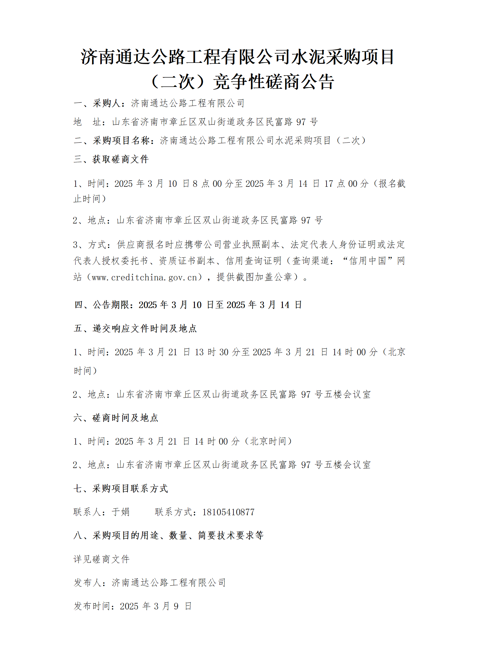 濟(jì)南通達(dá)公路工程有限公司水泥采購項(xiàng)目(二次)競爭性磋商公告