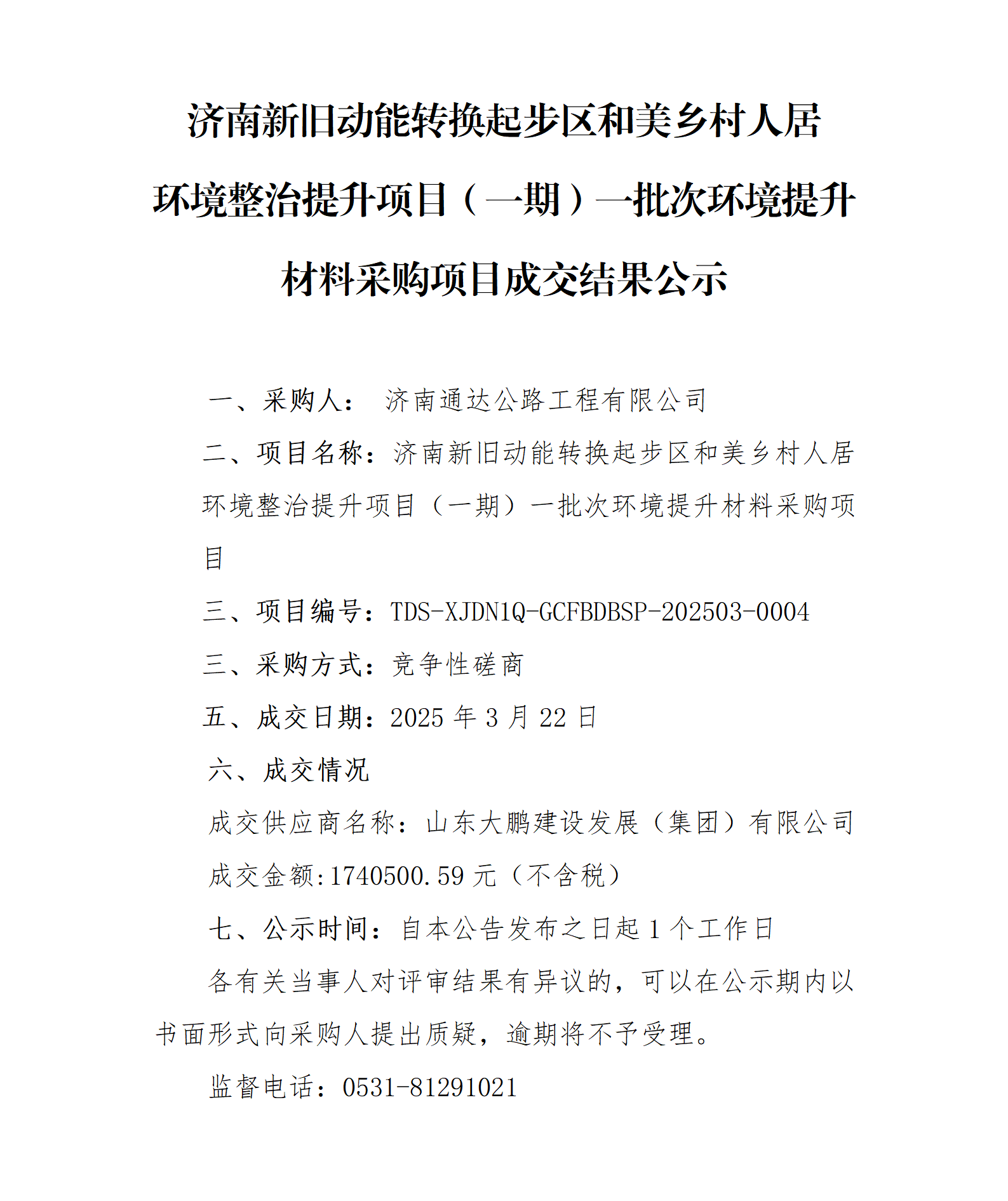 濟(jì)南新舊動能轉(zhuǎn)換起步區(qū)和美鄉(xiāng)村人居環(huán)境整治提升項目(一期)一批次環(huán)境提升材料采購項目成交結(jié)果公示