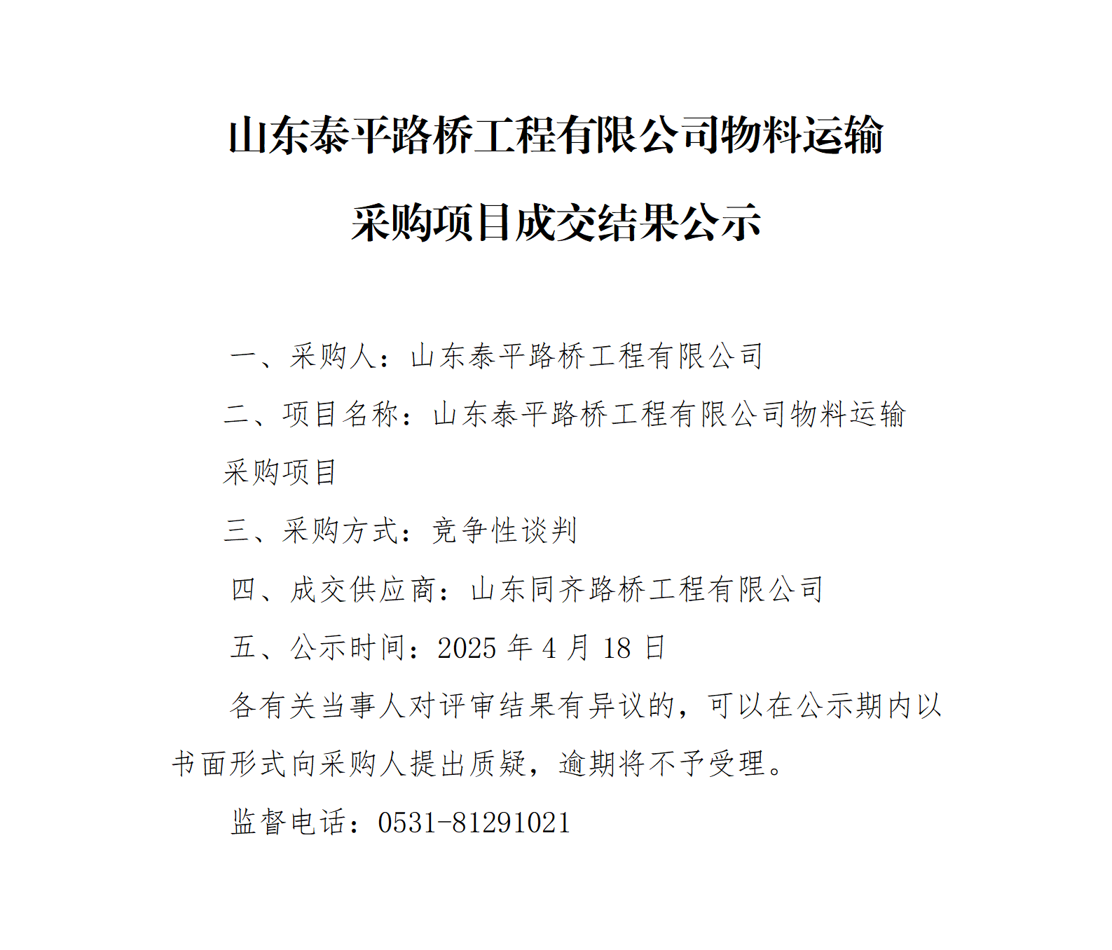 山東泰平路橋工程有限公司物料運(yùn)輸采購(gòu)項(xiàng)目成交結(jié)果公示