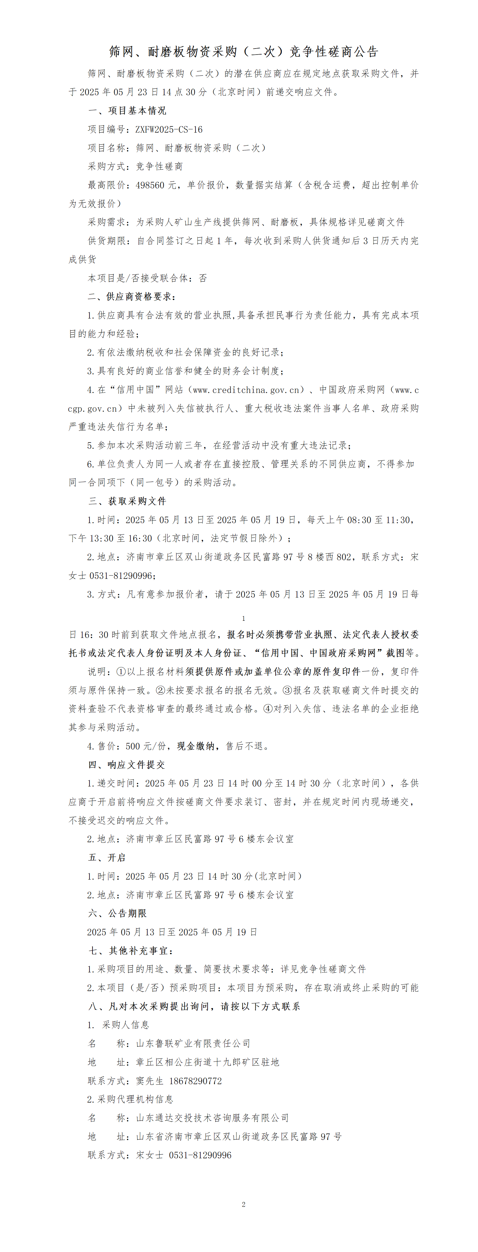 篩網(wǎng)、耐磨板物資采購(gòu)(二次)競(jìng)爭(zhēng)性磋商公告