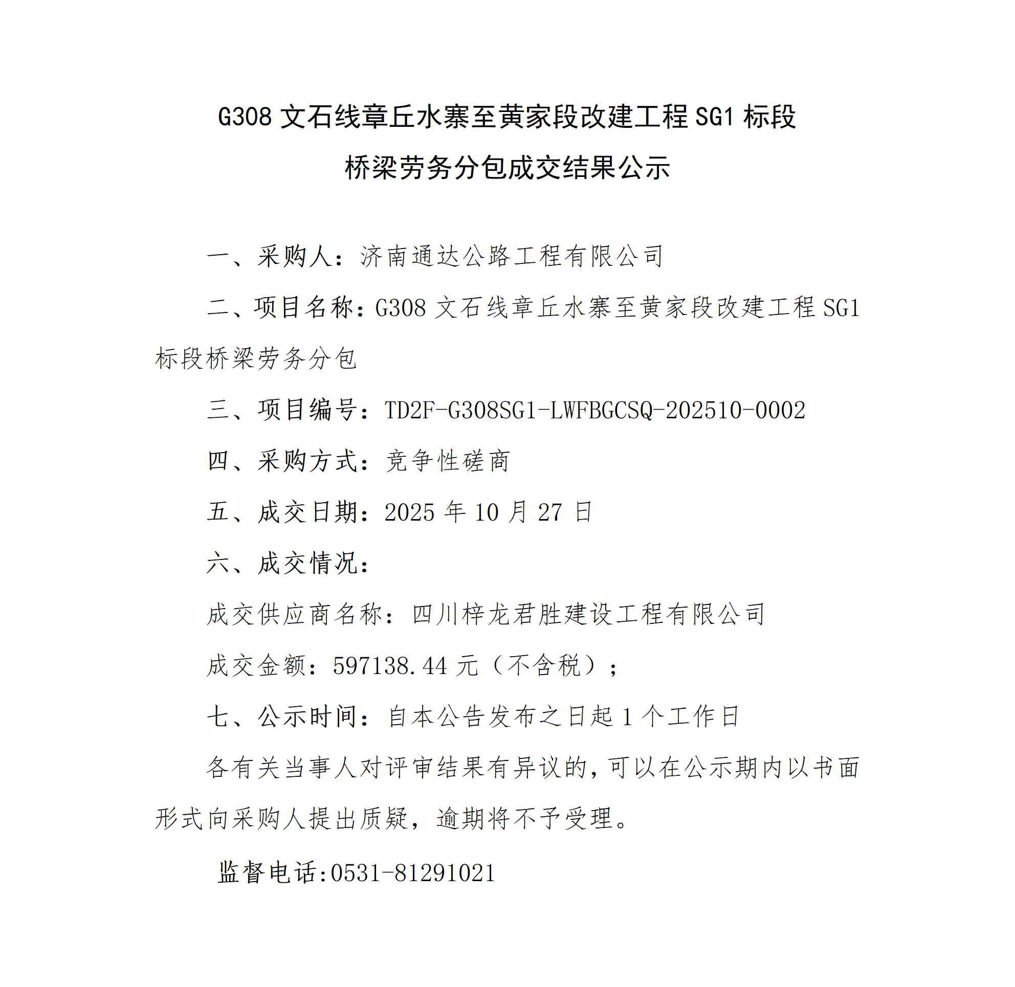 G308文石線章丘水寨至黃家段改建工程SG1標(biāo)段橋梁勞務(wù)分包成交結(jié)果公示