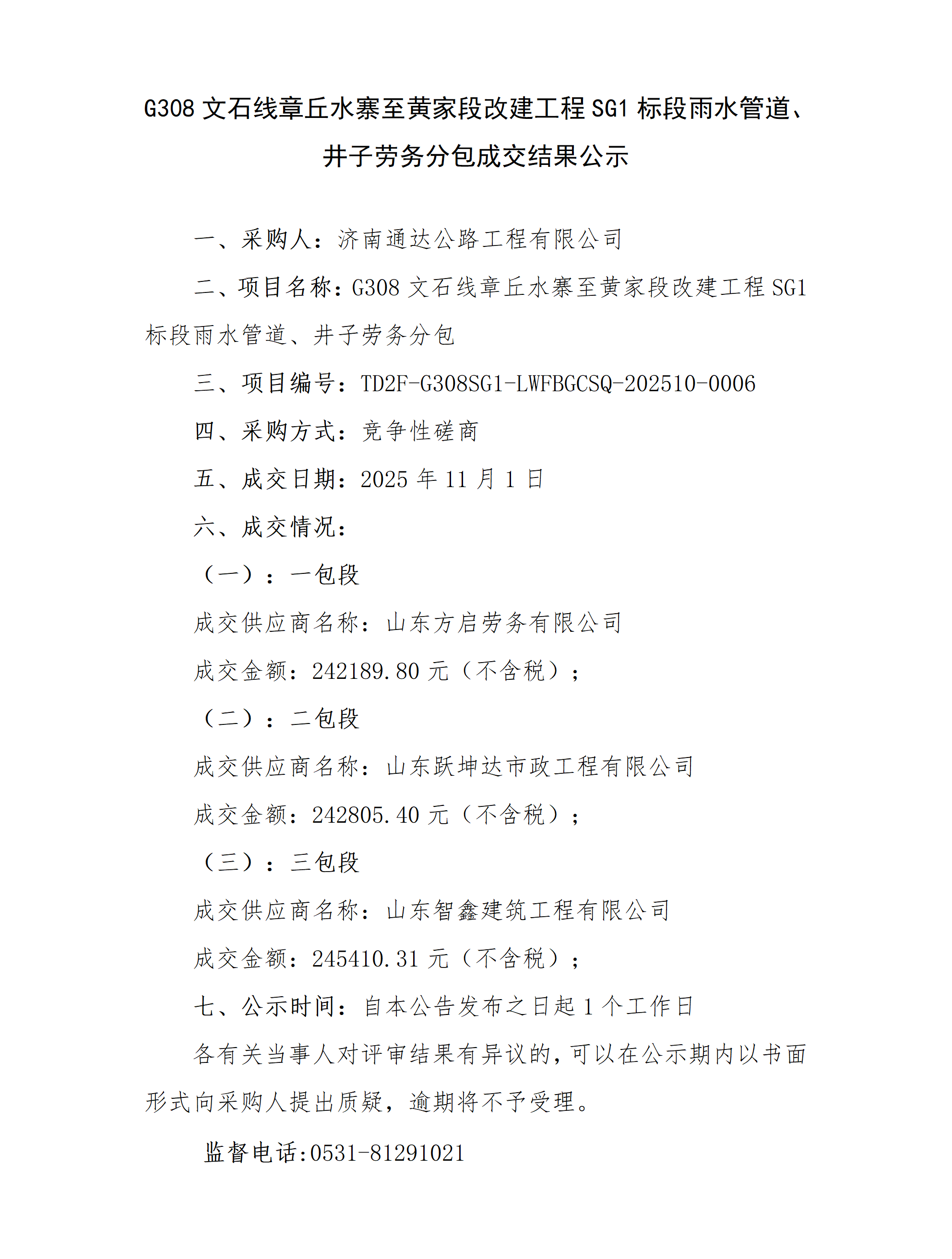 G308文石線章丘水寨至黃家段改建工程SG1標(biāo)段雨水管道、井子勞務(wù)分包成交結(jié)果公示