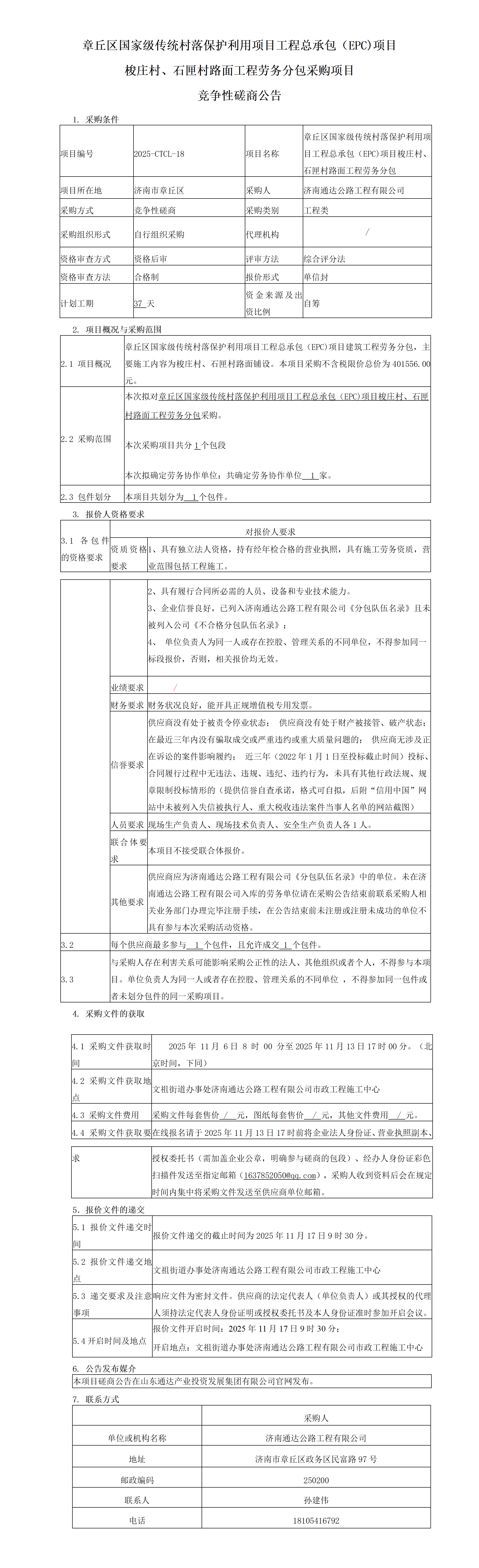 章丘區(qū)國(guó)家級(jí)傳統(tǒng)村落保護(hù)利用項(xiàng)目工程總承包(EPC)項(xiàng)目梭莊村、石匣村路面工程勞務(wù)分包采購(gòu)項(xiàng)目競(jìng)爭(zhēng)性磋商公告
