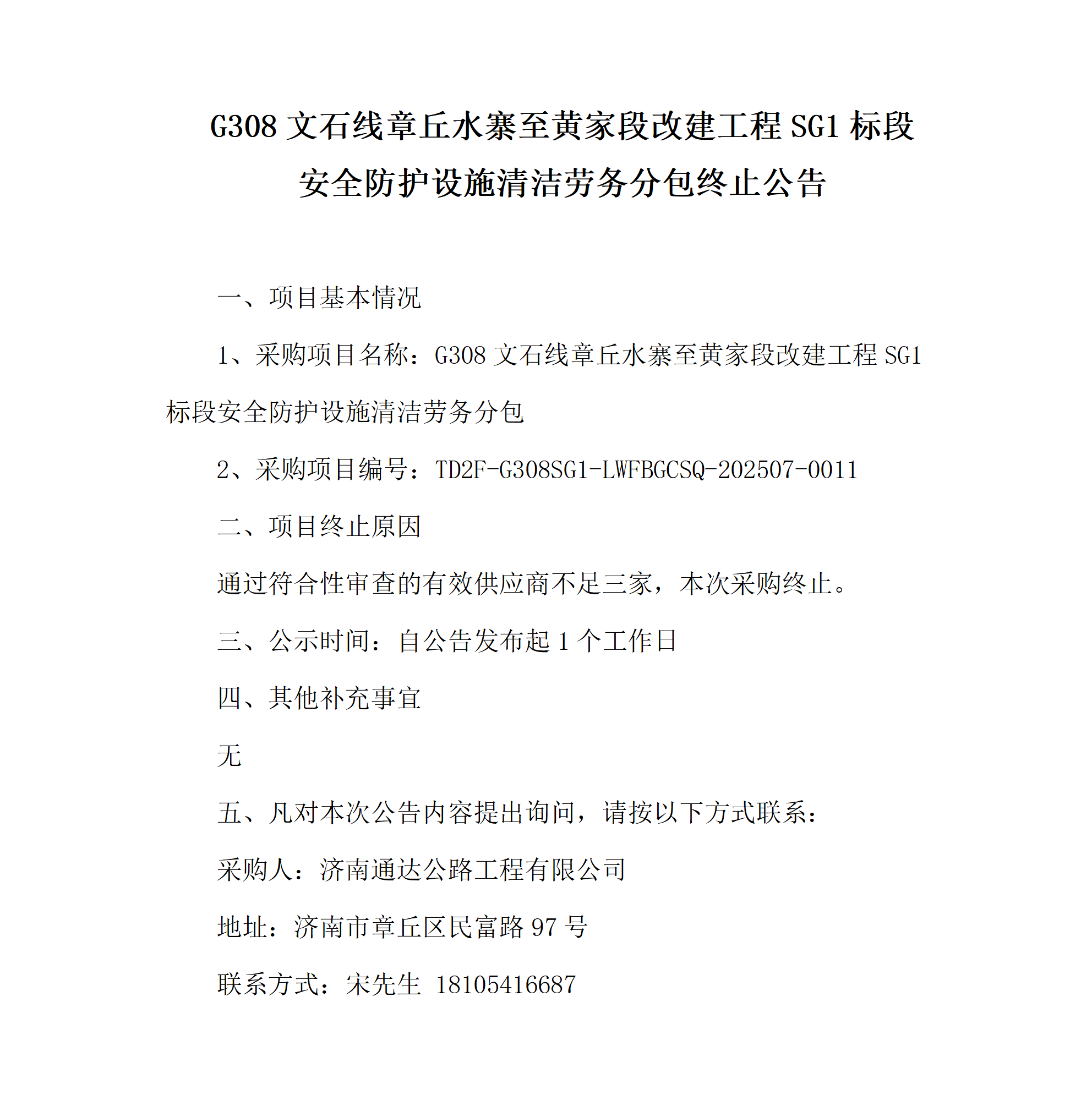 G308文石線章丘水寨至黃家段改建工程SG1標段安全防護設(shè)施清潔勞務(wù)分包終止公告